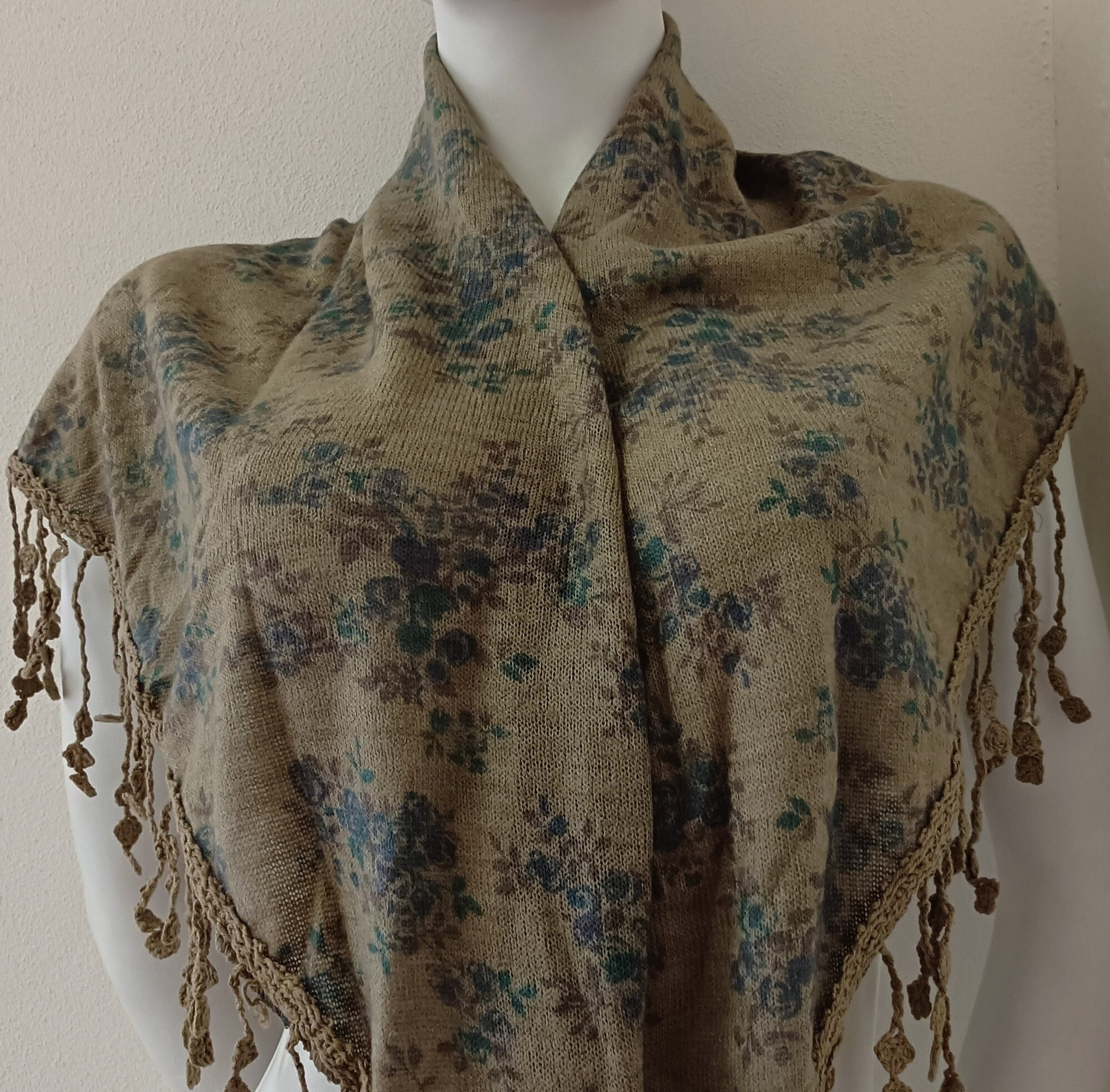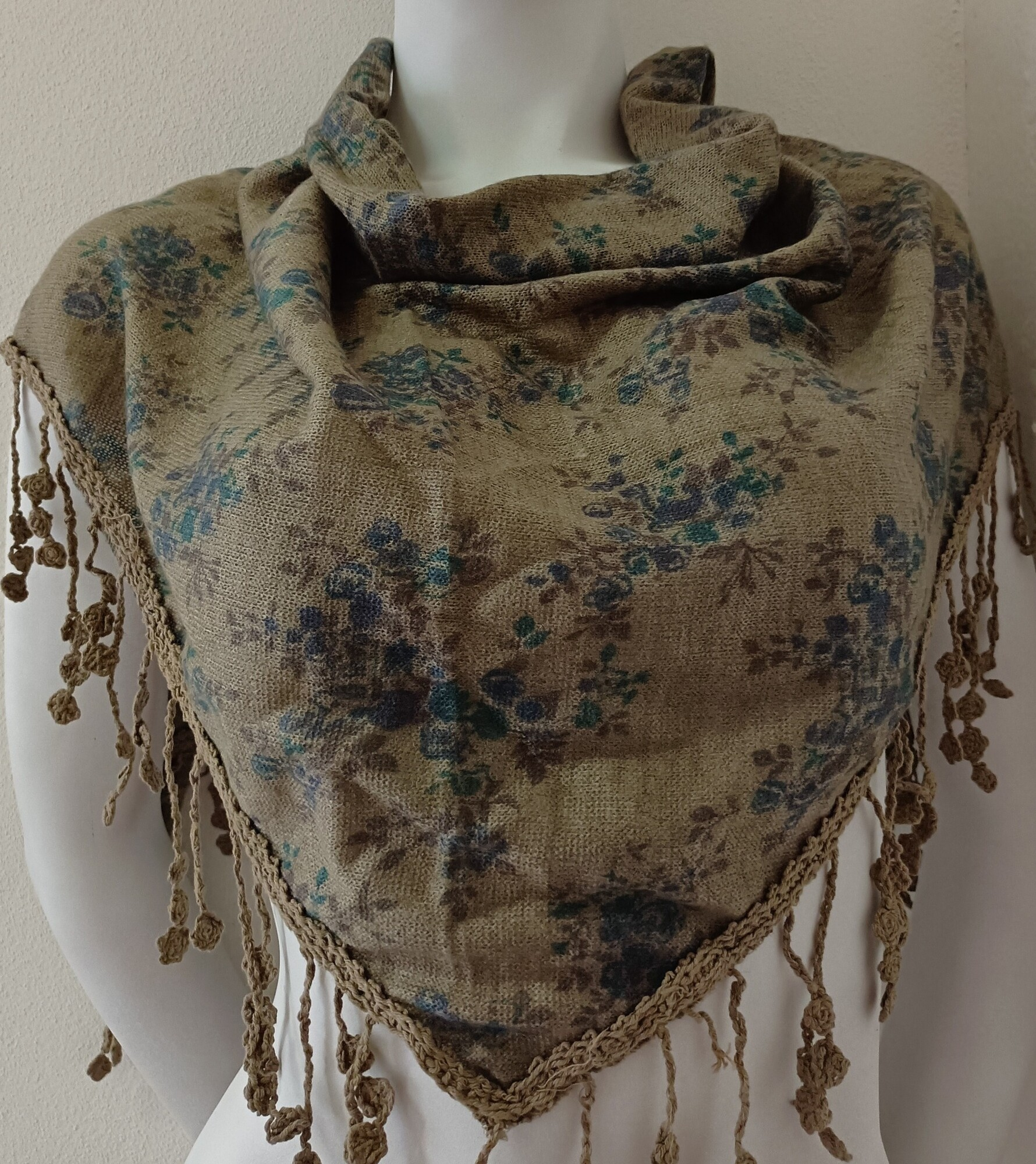 Dámský tmavě béžový trojhranný šátek s modrými květinkami.