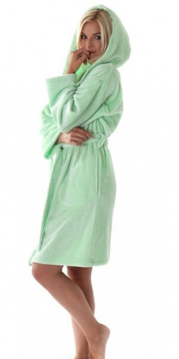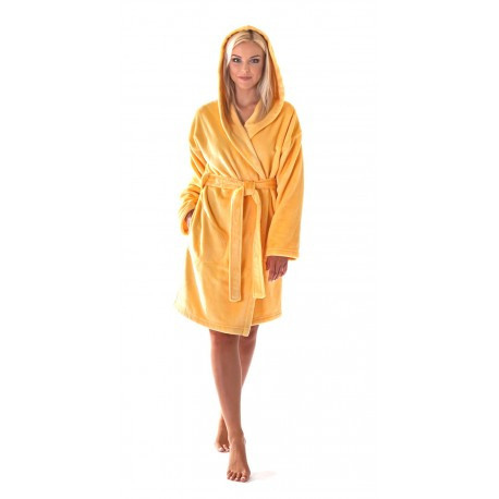 Dámský župan je klasického střihu s kapucí, zavazováním na pásek.