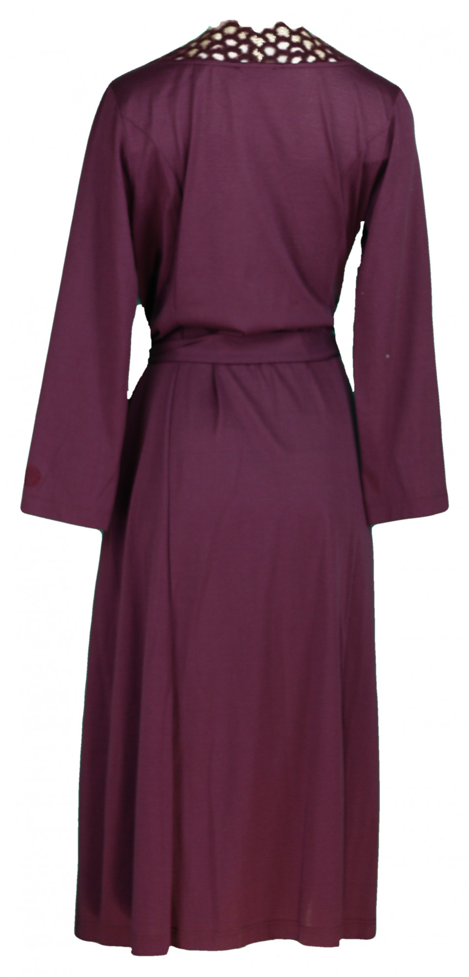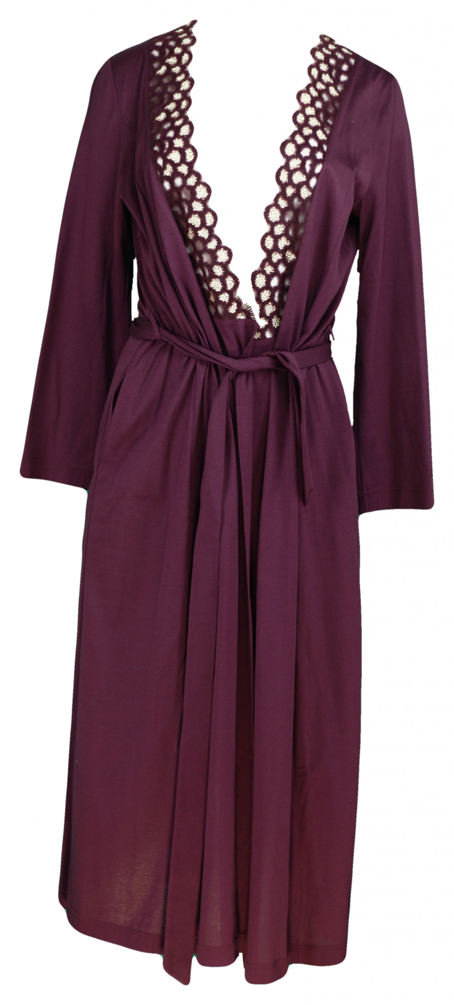 Dámský župan 3024053 - Féraud, je luxusní župan vínové barvy lemováný vyšívanou krajkou v zavinovacím stylu. Materiál - 100 % bavlna