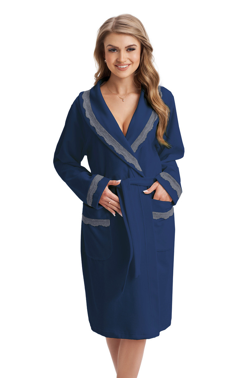 Elegantní dámský velurový župan. Límec i kapsy jsou obšité krajkou. V pase na zavázání.