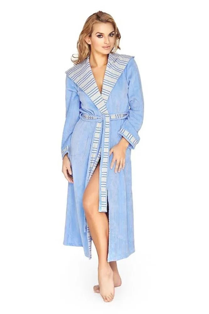 Dlouhý dámský župan s kapucí, všitými kapsami a zavazováním na pásek, ušitý z hřejivého materiálu termofroté.