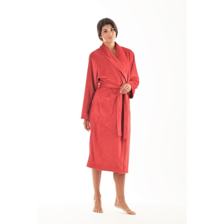 Kašmírový vzor vypalovaný na hebkém mikrovláknu v dámské kolekci Shanti nabízíme ve dvou střihových variantách – se šálovým límcem a se sedlem, zapínaný na knoflíky. Použitý materiál je lehký, splývavý, příjemný na dotyk, velmi snadno se udržuje, je tvarově i barevně stálý. Oba modely mají kapsy v bočním švu a na objednávku je vyrábíme i v nadměrných velikostech.