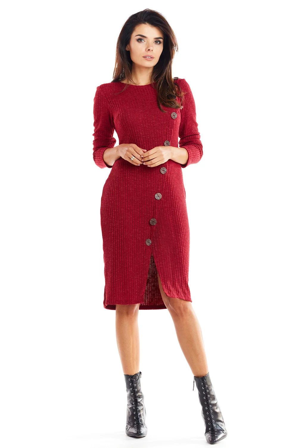 Elegantní šaty střižené na postavu s 3/4 rukávy. Knoflíky našité na přední straně v asymetrické linii dodávají šatům charakter. Šaty jsou vyrobeny z měkkého úpletu