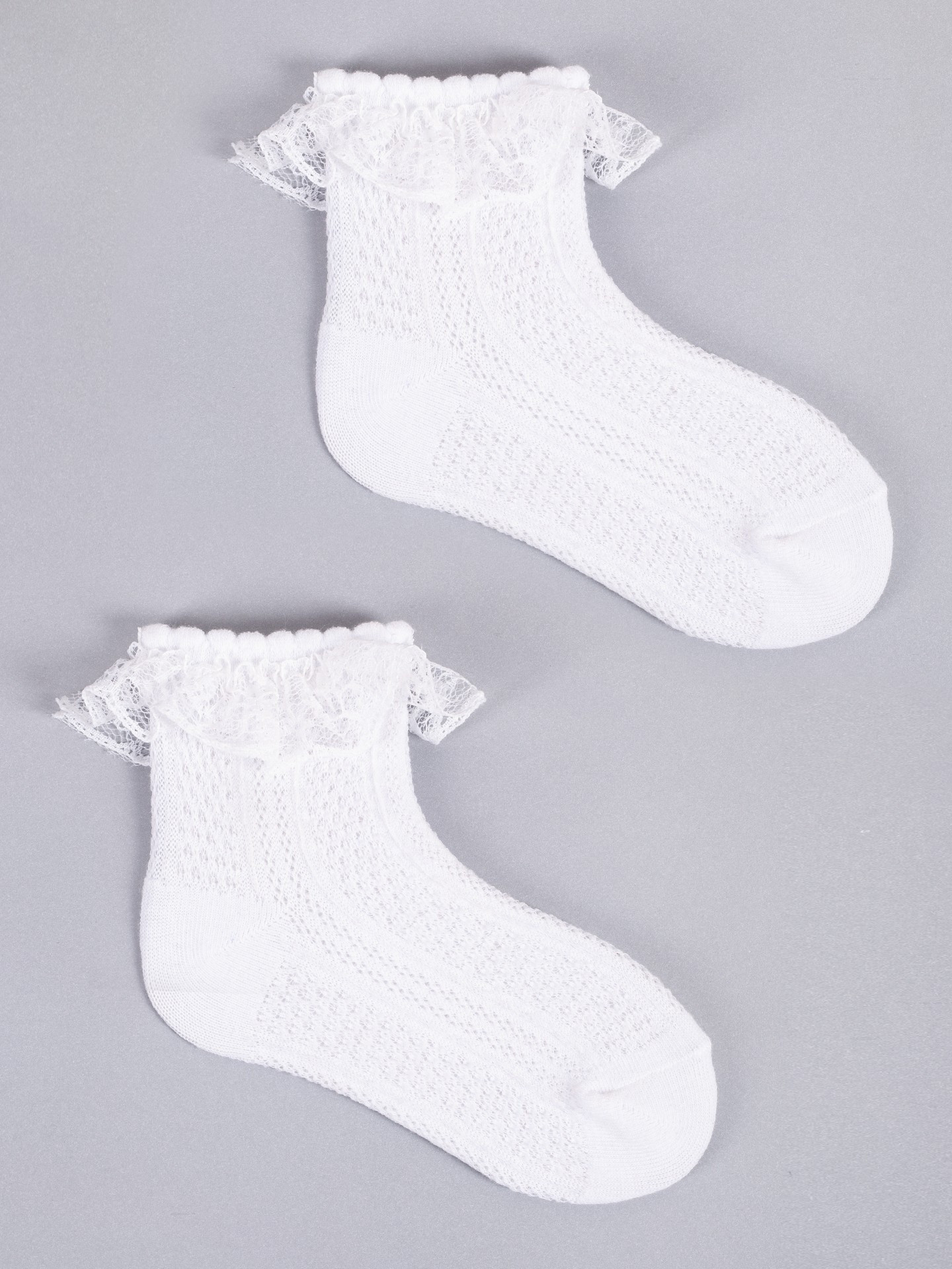 Dívčí ponožky se prodávají v praktickém trojbalení v bílé barvě. Ponožky jsou příjemné na dotek a mají nepřilnavý lem. Originální ozdobou je ohrnutí s jemným volánkem. Díky bavlněné ažurové struktuře jsou vzdušné a příjemné na dotek. Ideální pro teplejší dny.