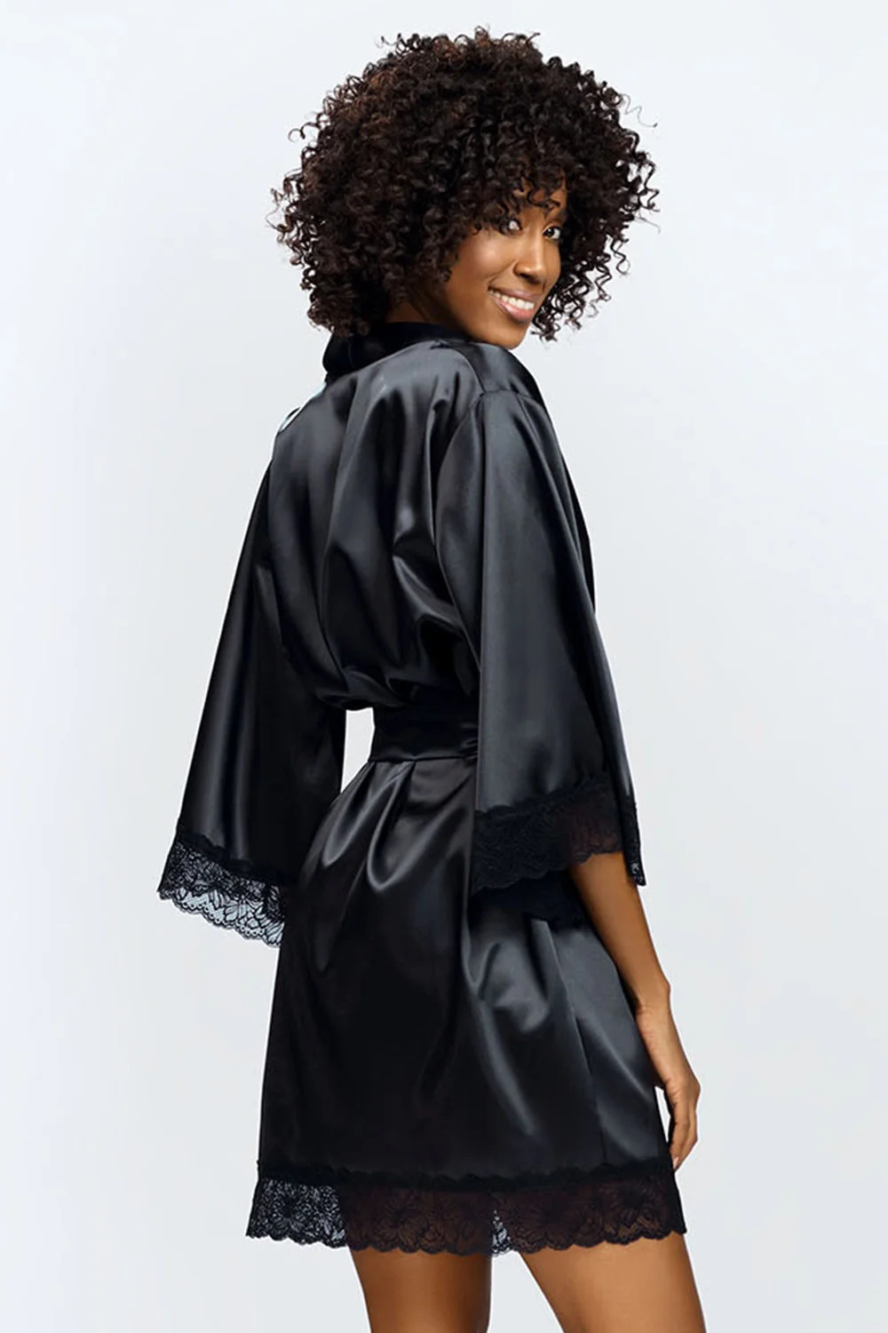 Župan je vyrobený ze 100% polyesteru typu satén. Je lehký, příjemný na těle a jemný na omak. Má 3/4 rukávy zakončené krajkou. Dolní lem tvoří pás krajky. Župan má pásek a je zavinovací. Má černou barvu. Je balený v dárkové krabičce.