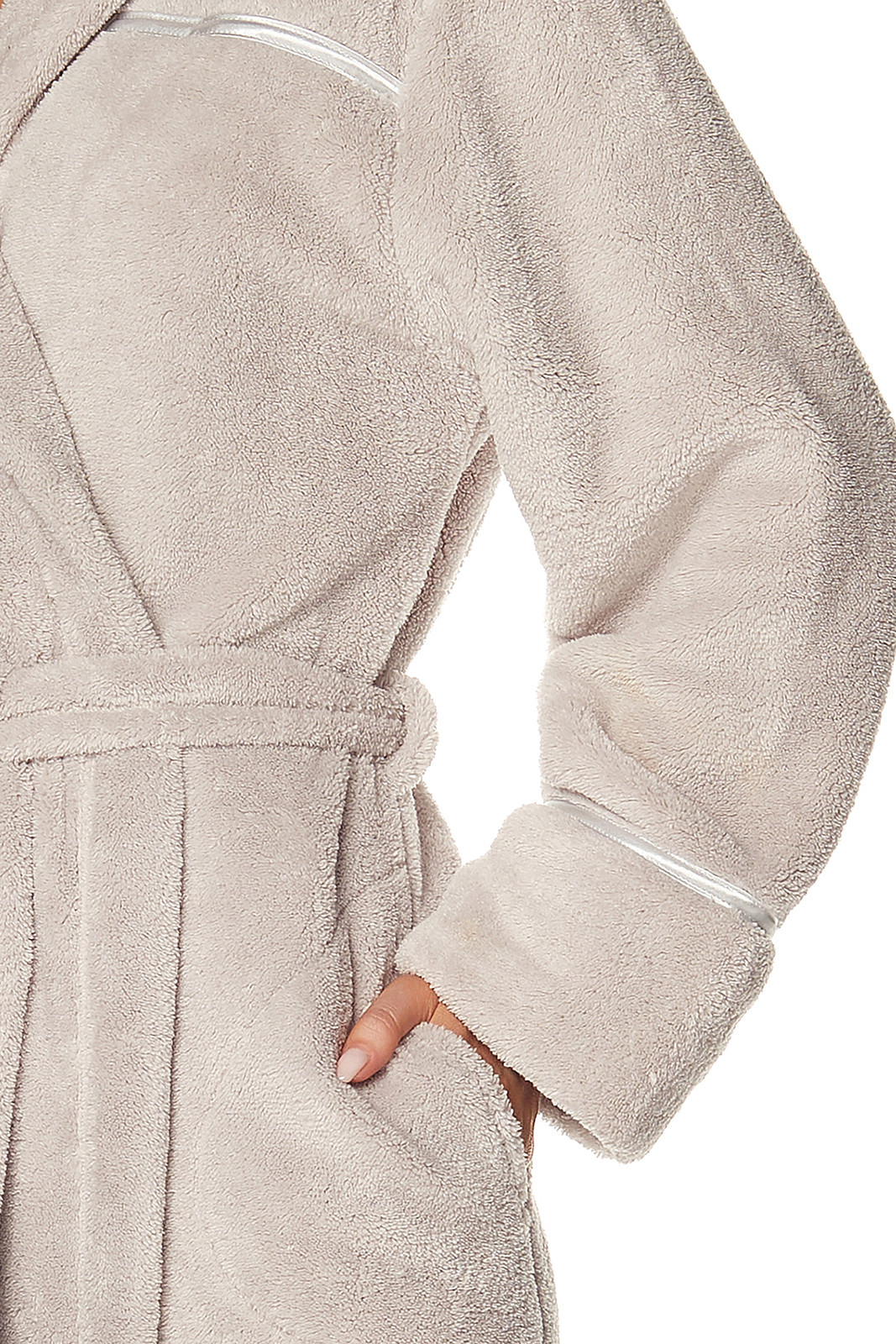 Župan má šálový límec. Model je ozdobený saténovým prošitím. Župan má na bocích kapsy a v pase se zavazuje.
