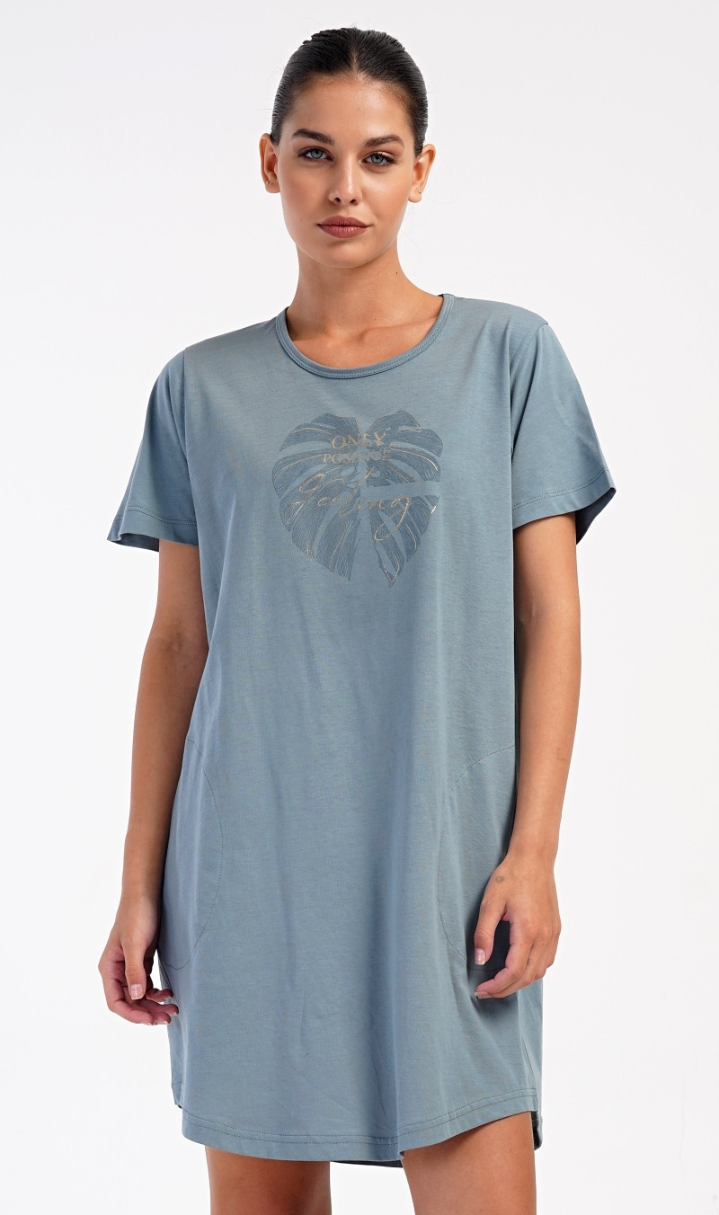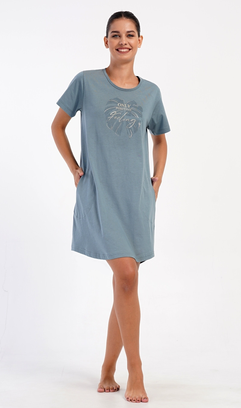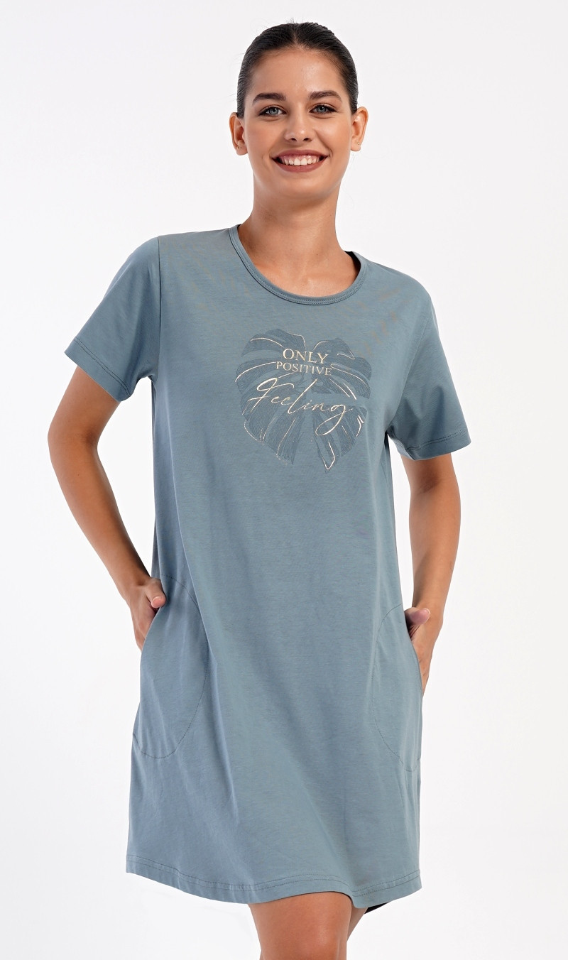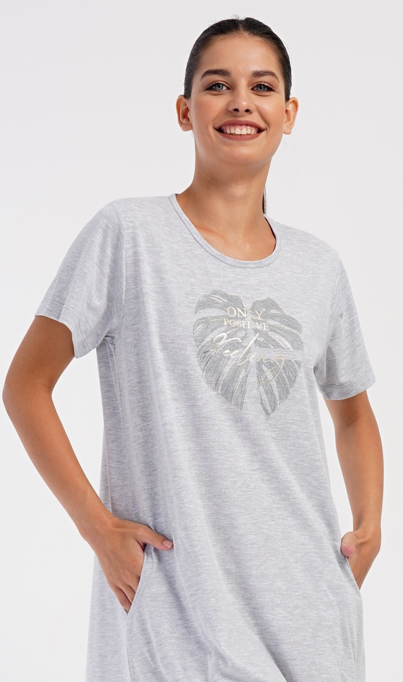 Dámské domácí šaty s krátkým rukávem Alžběta. Domácí jednobarevné šaty s kulatým výstřihem a kapsami zdobí obrázek velkého listu a nápis 'Only positive feeling'. Použitý bavlněný materiál je příjemný a poddajný na dotek. Šaty jsou pohodlné, využijete je téměř při všech volnočasových aktivitách. Jsou vhodné na spaní i na denní nošení. Obsah bavlny u tmavě šedé barvy je 100% a u světle šedé 70%.