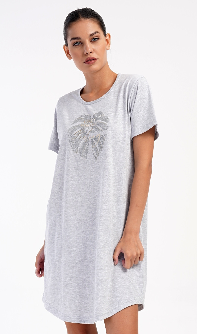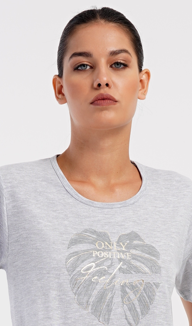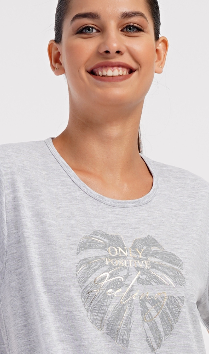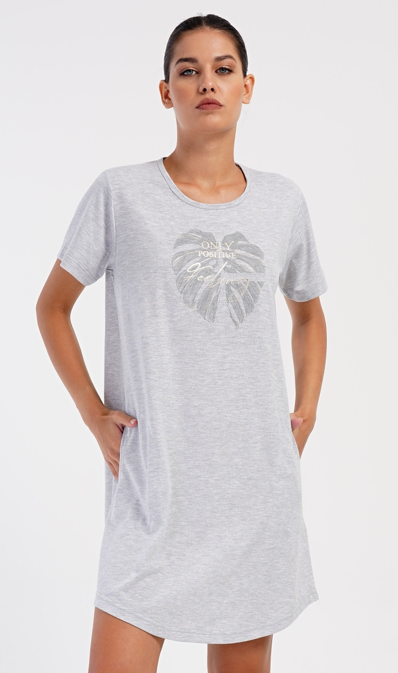 Dámské domácí šaty s krátkým rukávem Alžběta. Domácí jednobarevné šaty s kulatým výstřihem a kapsami zdobí obrázek velkého listu a nápis 'Only positive feeling'. Použitý bavlněný materiál je příjemný a poddajný na dotek. Šaty jsou pohodlné, využijete je téměř při všech volnočasových aktivitách. Jsou vhodné na spaní i na denní nošení. Obsah bavlny u tmavě šedé barvy je 100% a u světle šedé 70%.