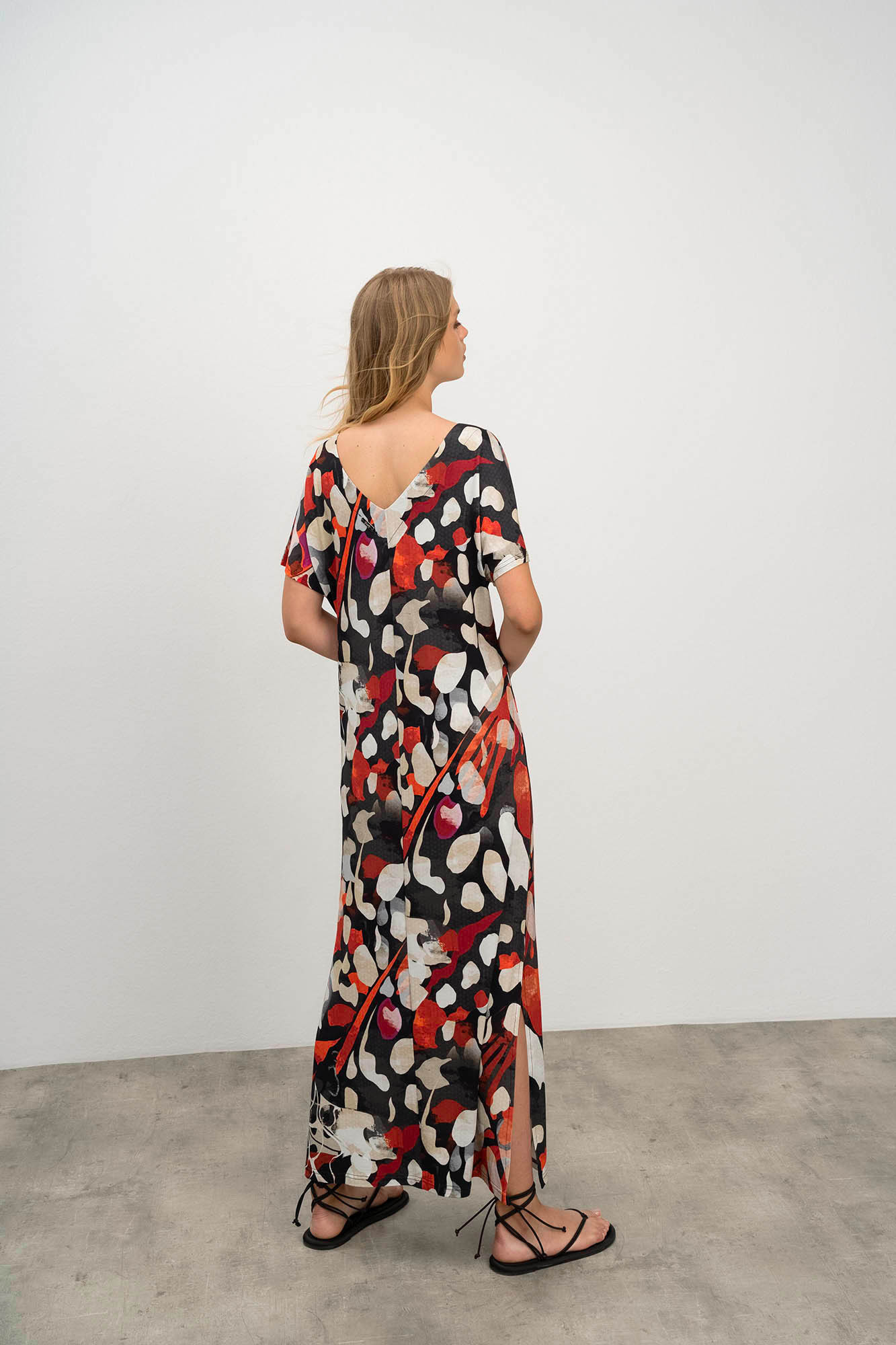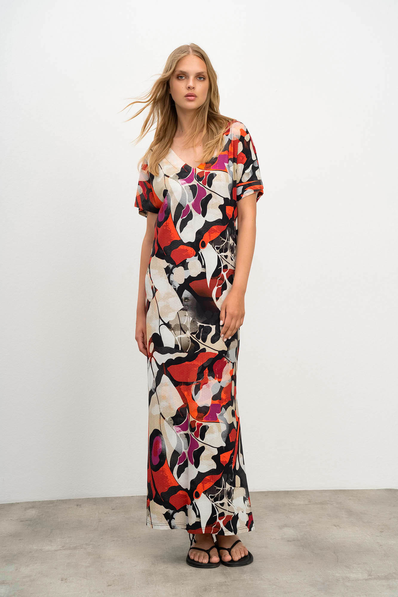 Elegantní dlouhé vzorované dámské šaty s výstřihem do V a krátkým rukávem, vše co žena v parných letních dnech potřebuje. Šaty jsou vyrobené z kvalitní jersey viskózy s příměsí elastanu. Jersey Viscoza se vyznačuje vysokou savostí, je dobře prodyšná, měkká a příjemná na dotek a elastan zaručuje lepší pružnost tkaniny.