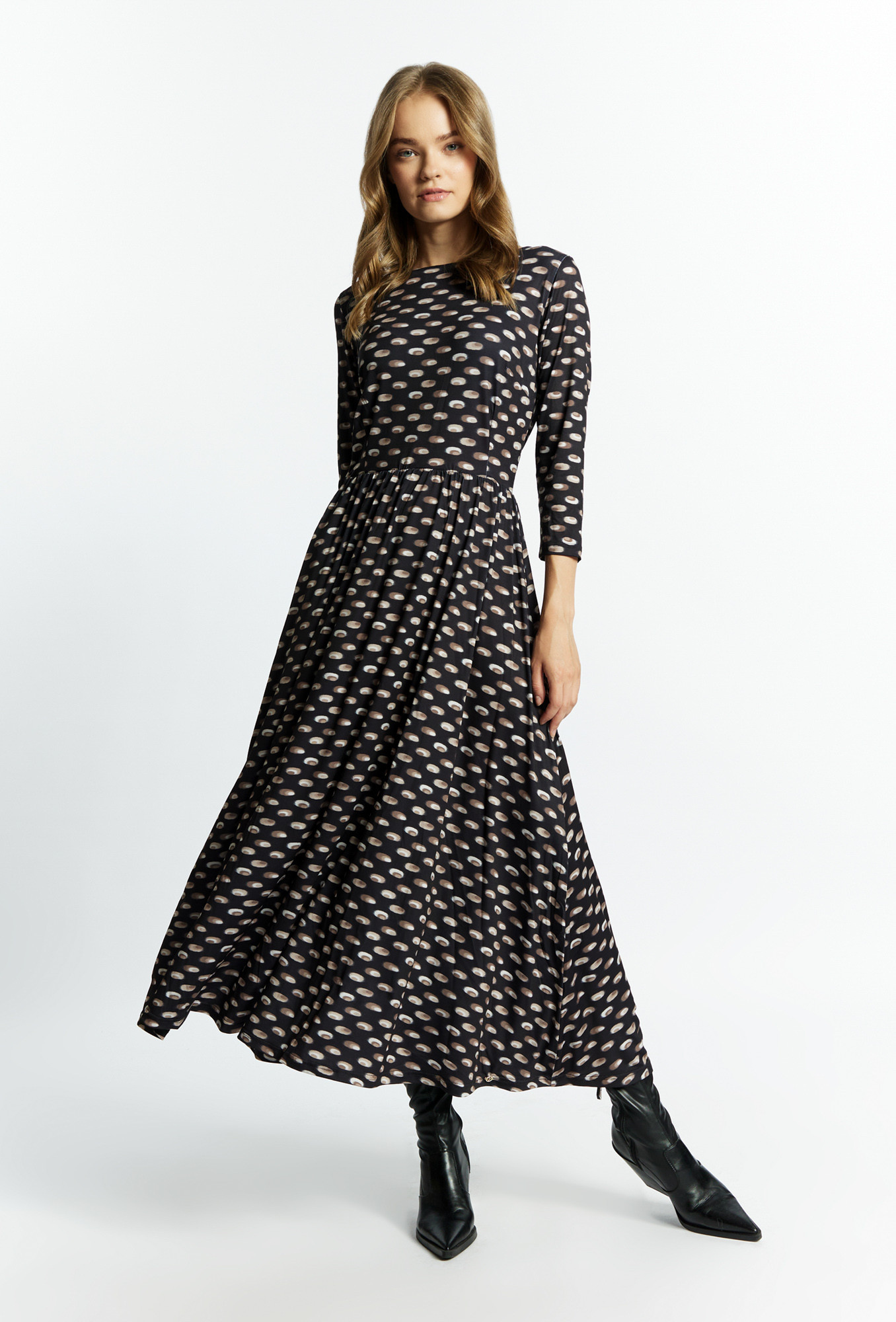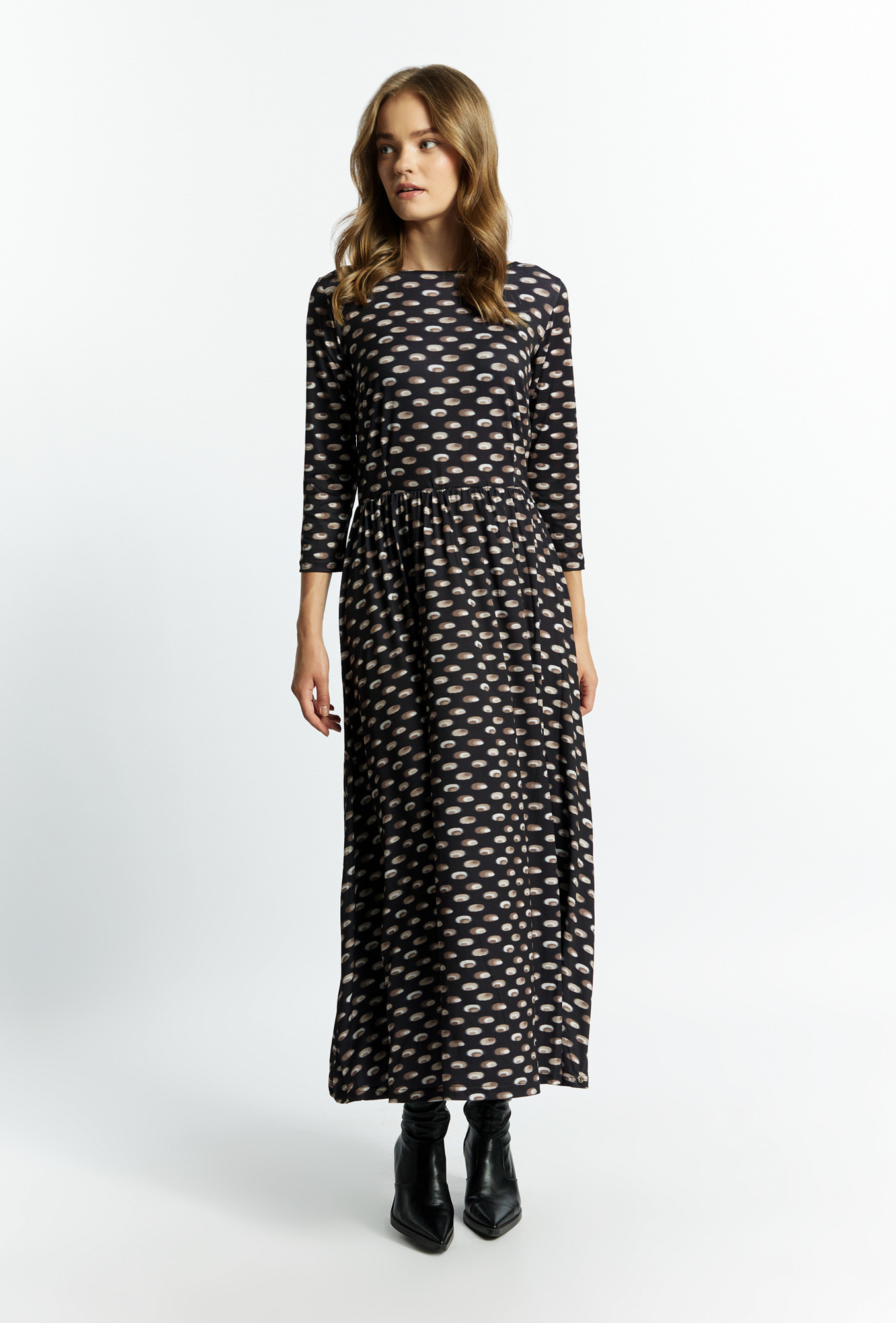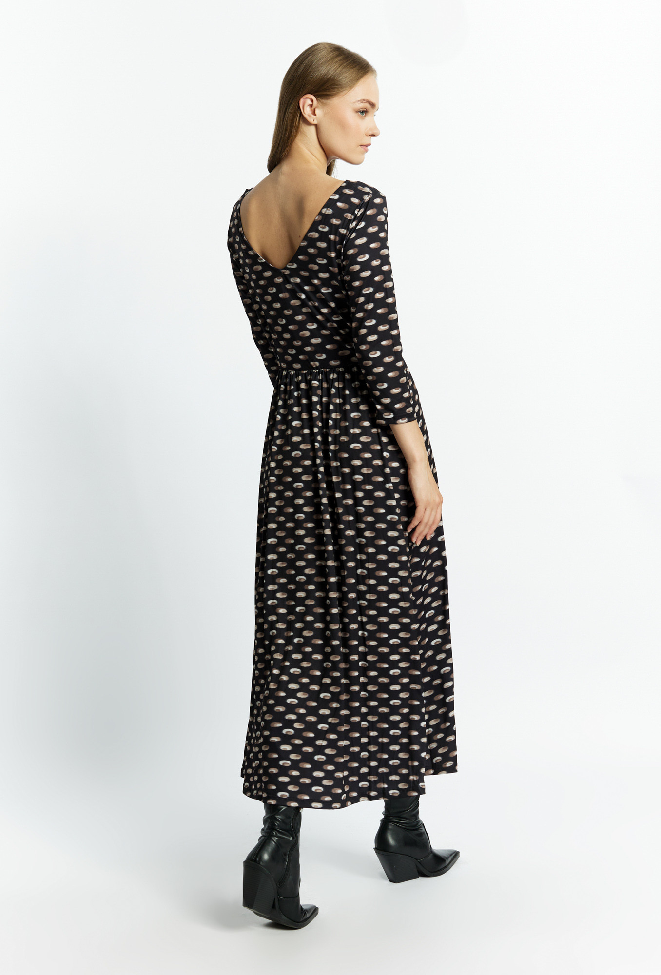 Elegantní dámské šaty z látky příjemné na dotek. Šaty s 3/4 rukávy, půlkulatým výstřihem a páskem v pase. Šaty jsou na zádech zdobené průstřihem. Tento model se jistě hodí pro zvláštní příležitosti. Modelka na obrázku je 177 cm vysoká a má velikost 36.