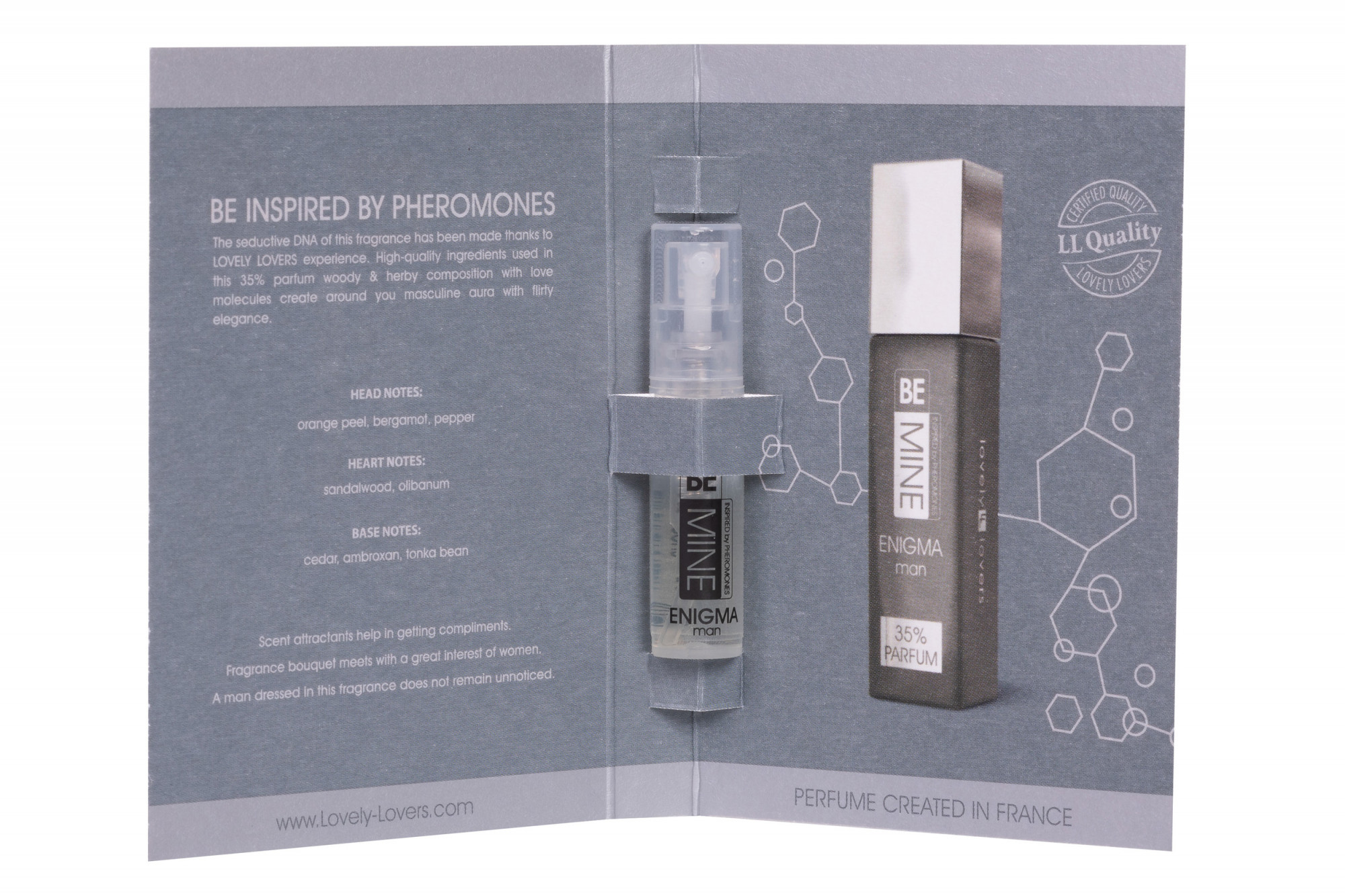 Jedinečná pánská vůně ze série BEMINE vytvořena ve Francii. Díky zkušenostem značky LOVELY LOVERS byl použit molekulární vzorec I-L-Molecules (INTENSE LOVE MOLECULES), který je výsledkem výzkumu více než 300 vonných atraktantů v různých poměrech. Byly vybrány ty, které mají největší dopad na opačné pohlaví, čímž se z komplexu vonných olejů vytáhlo maximum. Vzorec I-L-Molecules byl zdokonalen tak, aby se synergicky doplňoval s vůní pánské pokožky a vytvořil tak jedinečný celek. Složení BEMINE ENIGMA pro muže je jedinečnou kombinací dřevitých a bylinných tónů, propletených se svěžestí květů doplněných citrusovými plody. Nejvyšší koncentrace 35% a kvalita použitých ingrediencí vám umožní vytvořit svůdnou auru plnou mužských vibrací a flirtující elegance.