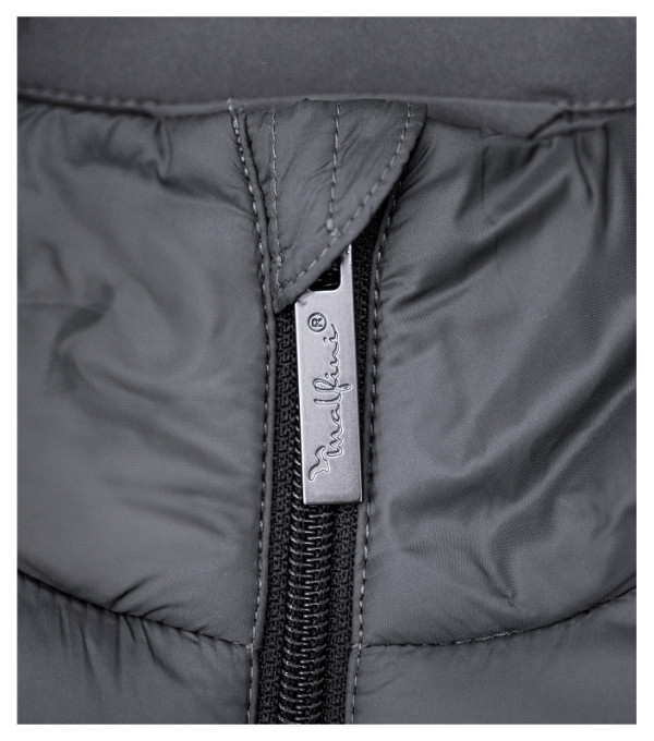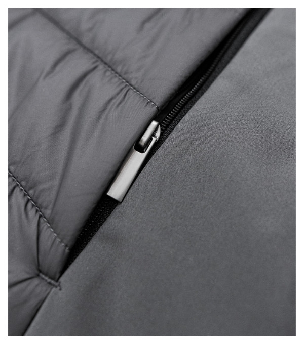 kombinace prošívaného a softshellového materiálu střih tvarovaný bočními díly celopropínací spirálový zip s krytkou brady boční kapsy se spirálovým zipem vnitřní náprsní kapsa na zip tvarovaný a mírně prodloužený zadní díl vstup pro branding v podšívce zadního dílu