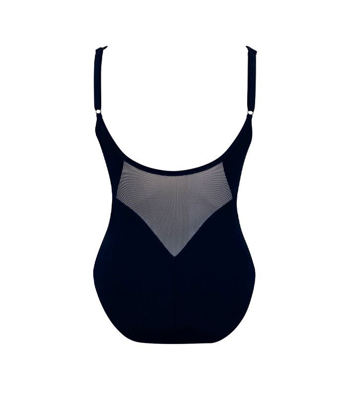 Dámské jednodílné luxusní plavky s posouvacími ramínky. Košíčky podšité, s kosticemi a spodní gumou na komfort při nošení. S okrasnými prvky - síťovinou kolem dekoltu a na zádech, síťovina je podšitá.74% Pol