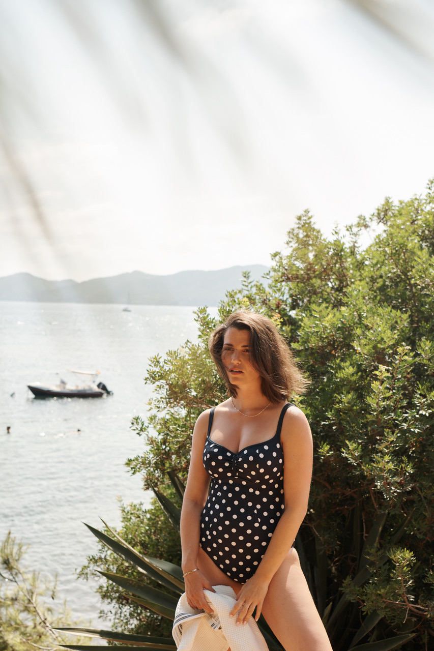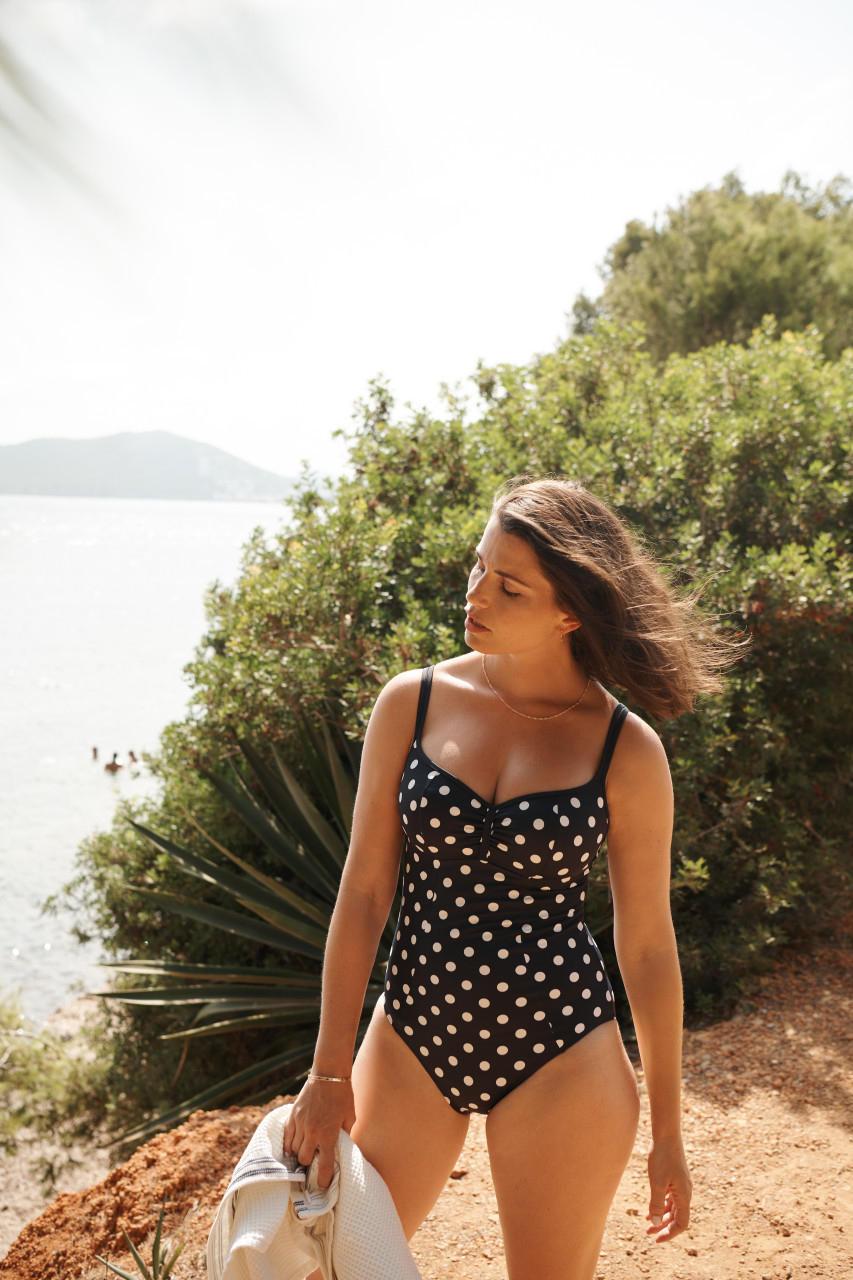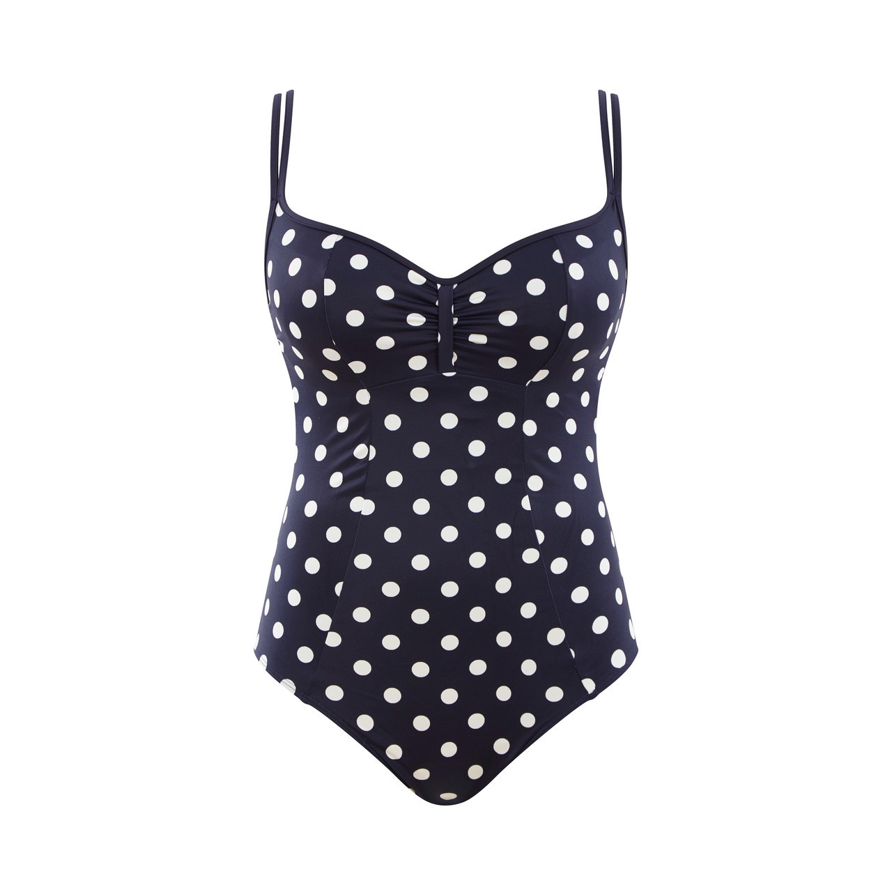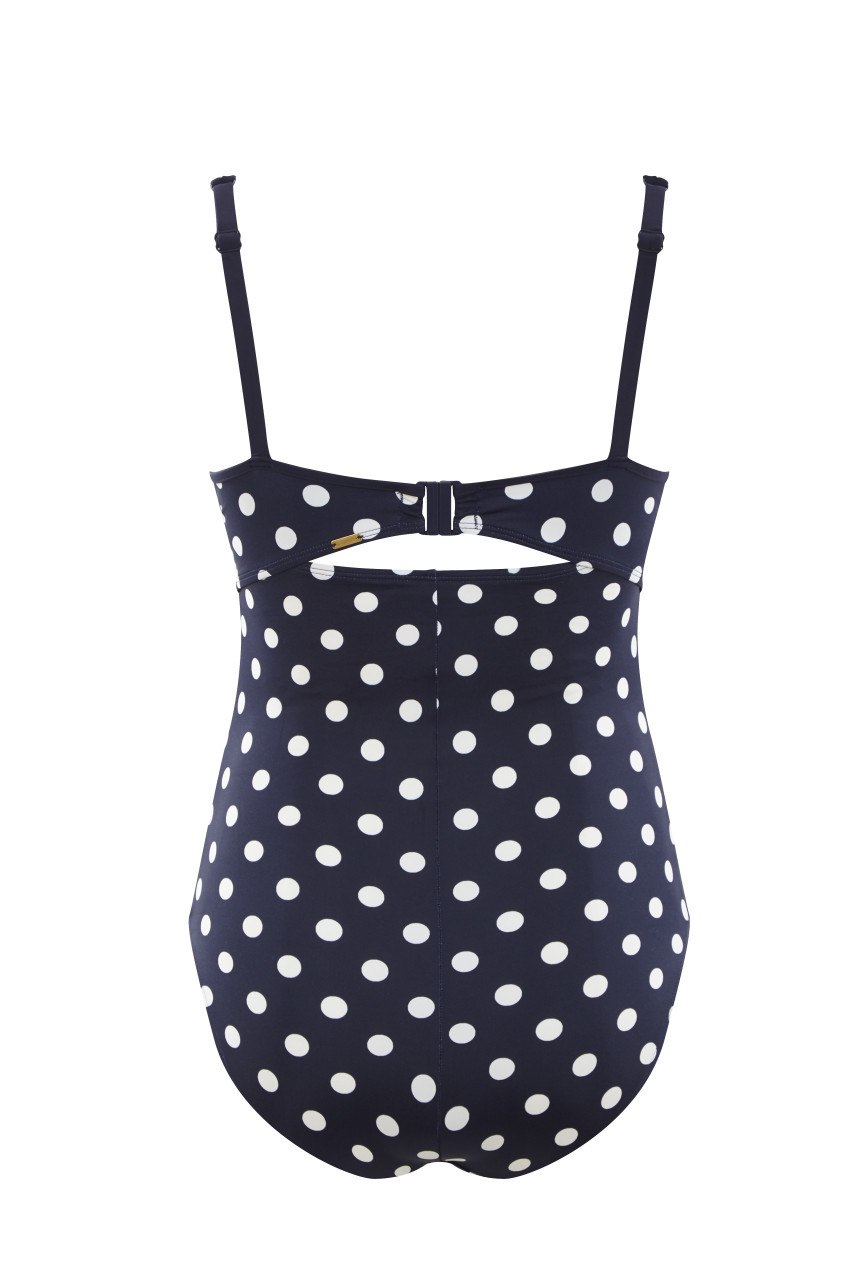 Dámské jednodílné luxusní plavky s puntíkovým vzorem. Podprsenka podšitá, s kosticemi, se zapínáním na zádech. Ramínka posouvací.
