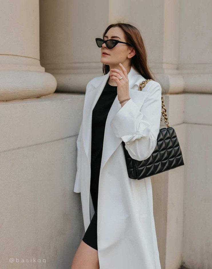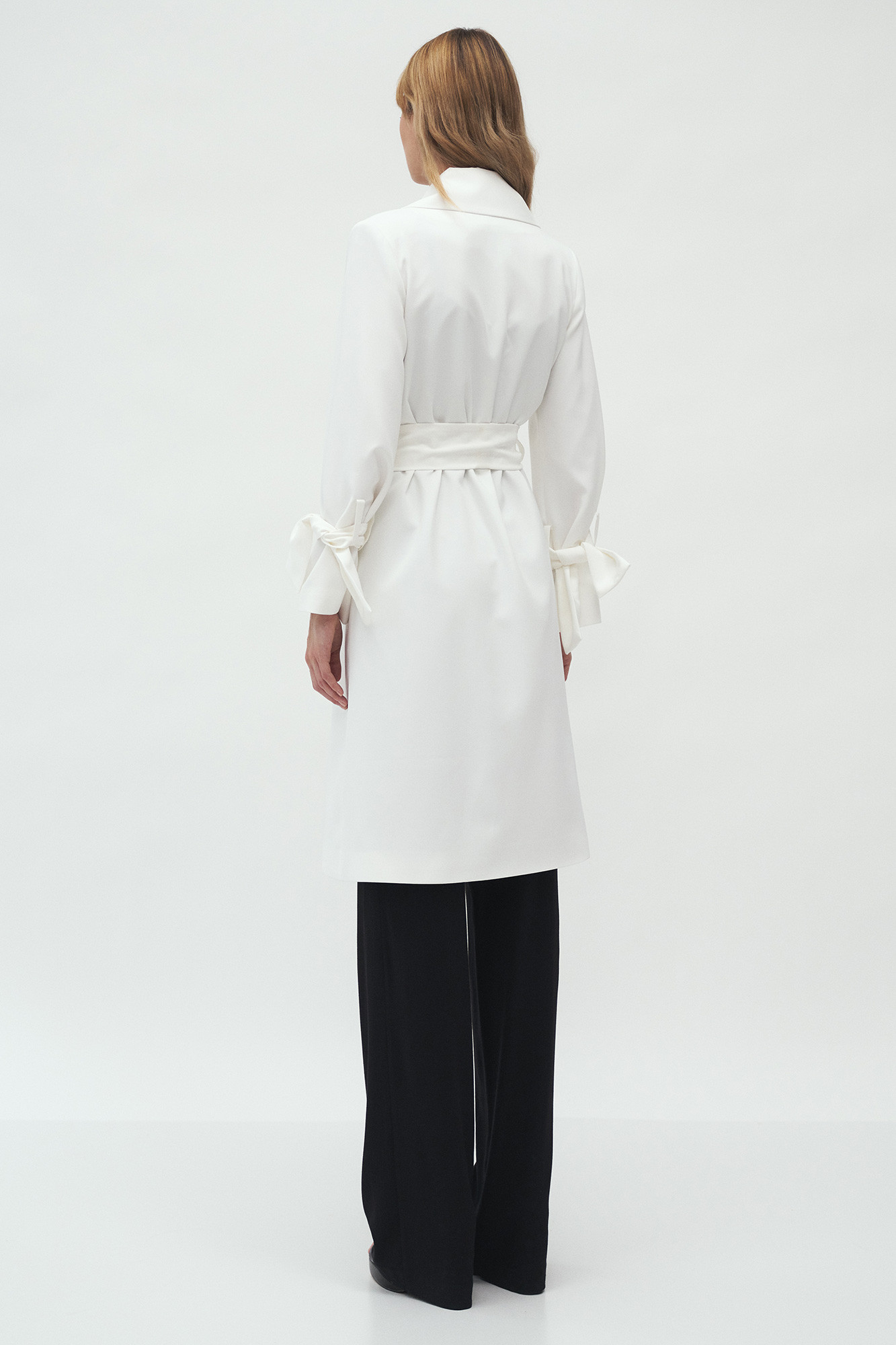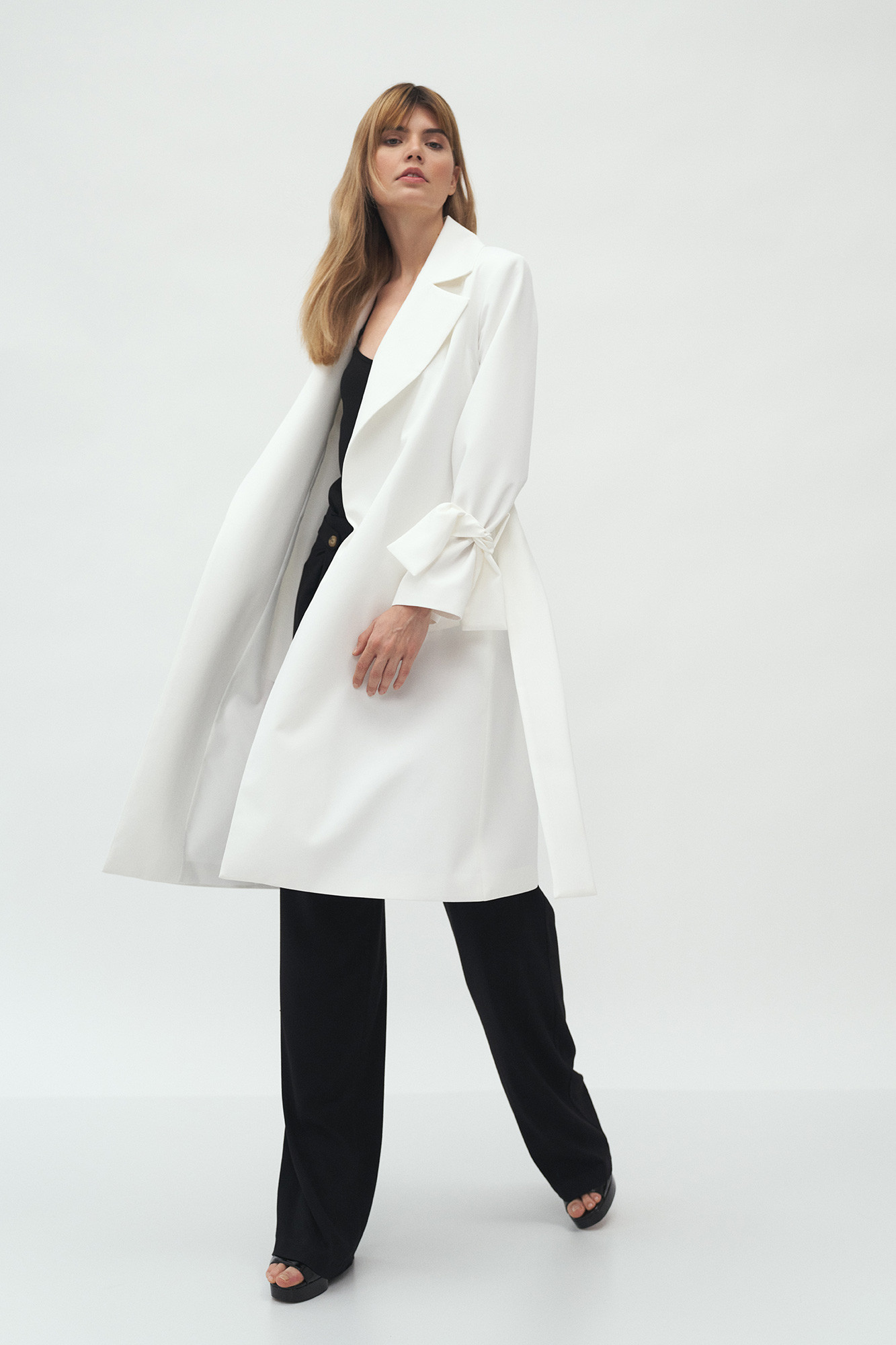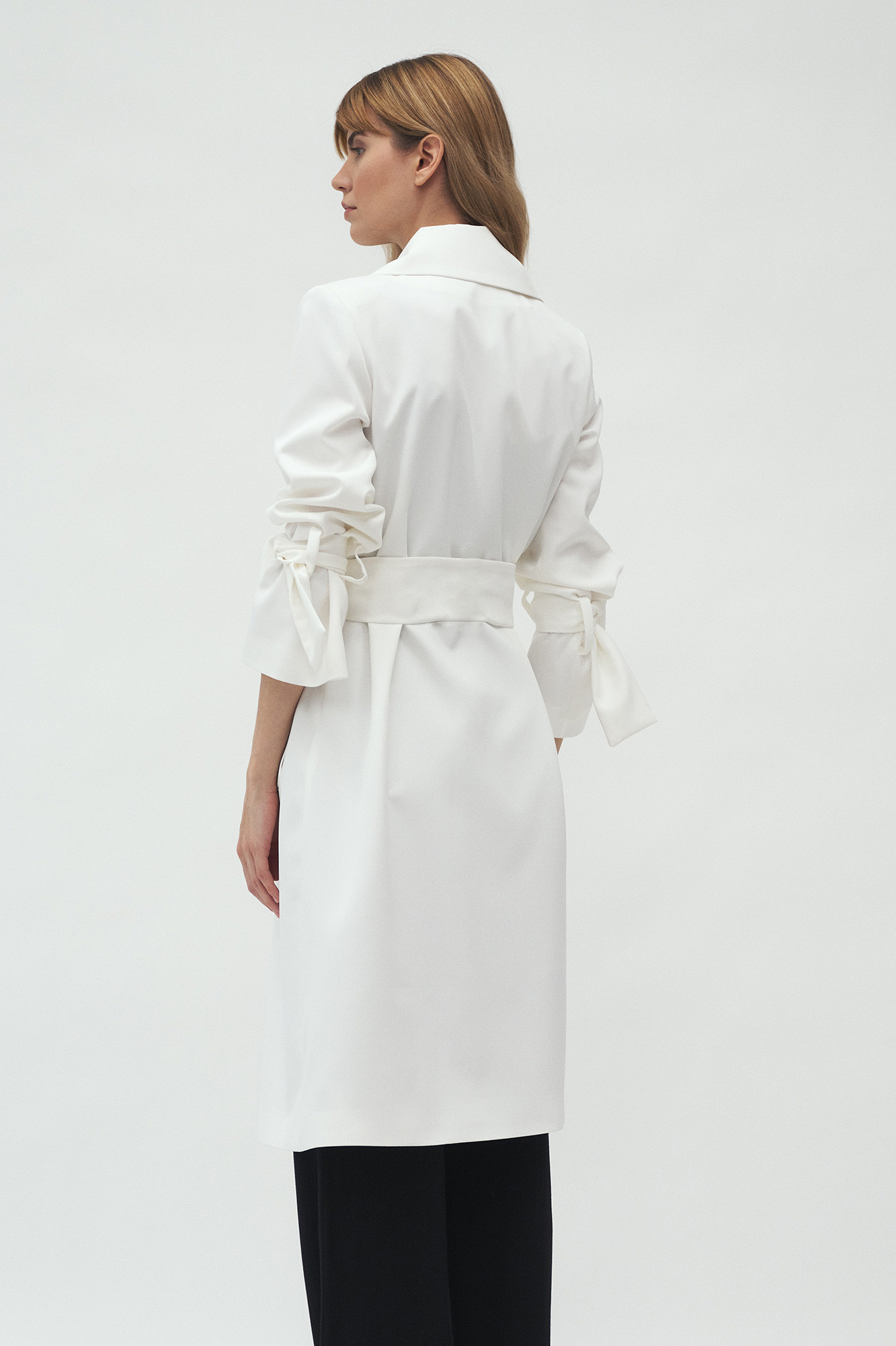 Kabát s délkou ke kolenům, páskem na zavázání v pase, širokými klopami a předními kapsami. Pásky na zavazování v manžetách umožňují upravit délku rukávů.