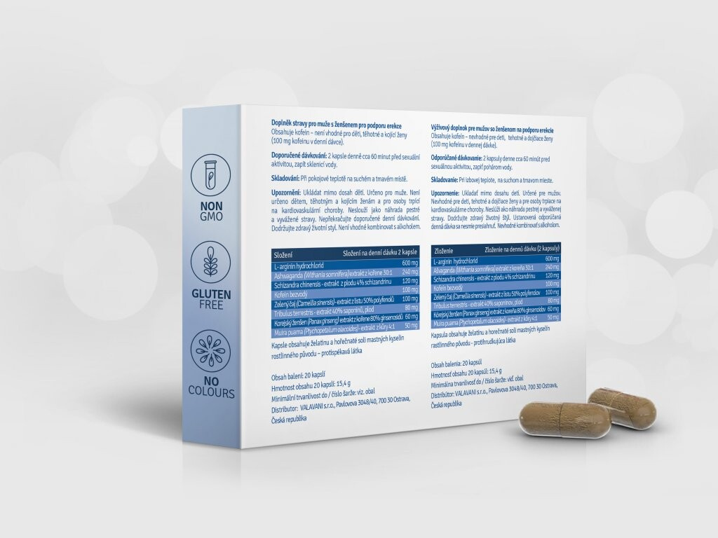 Doplněk stravy vyvinut speciálně pro muže. Pro jednorázové užívání před sexuální aktivitou. Extra silné vylepšené složení - v jedné denní dávce 1350mg směsi! (porovnejte s konkurencí). Přírodní produkt – základ produktu je tvořen čistě přírodními bylinnými extrakty.