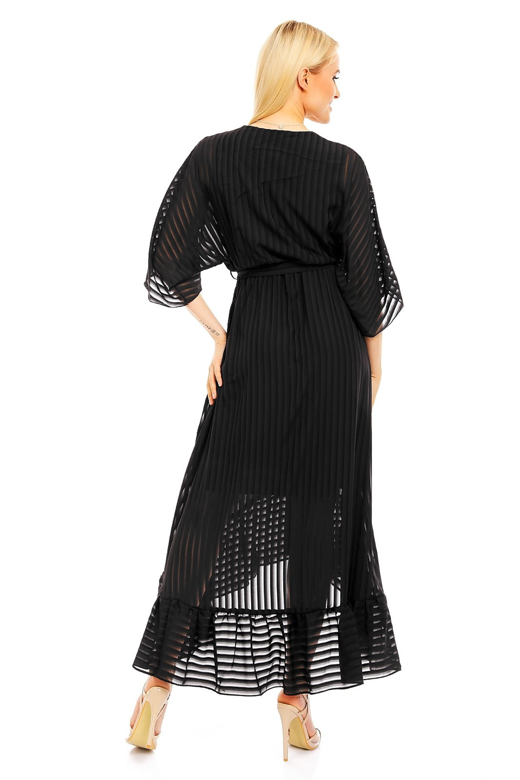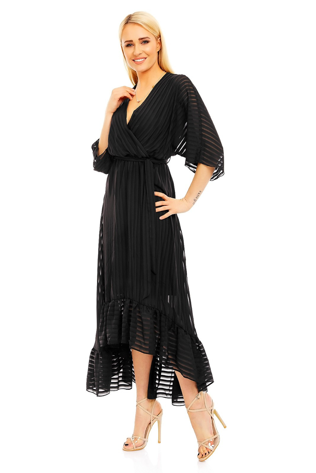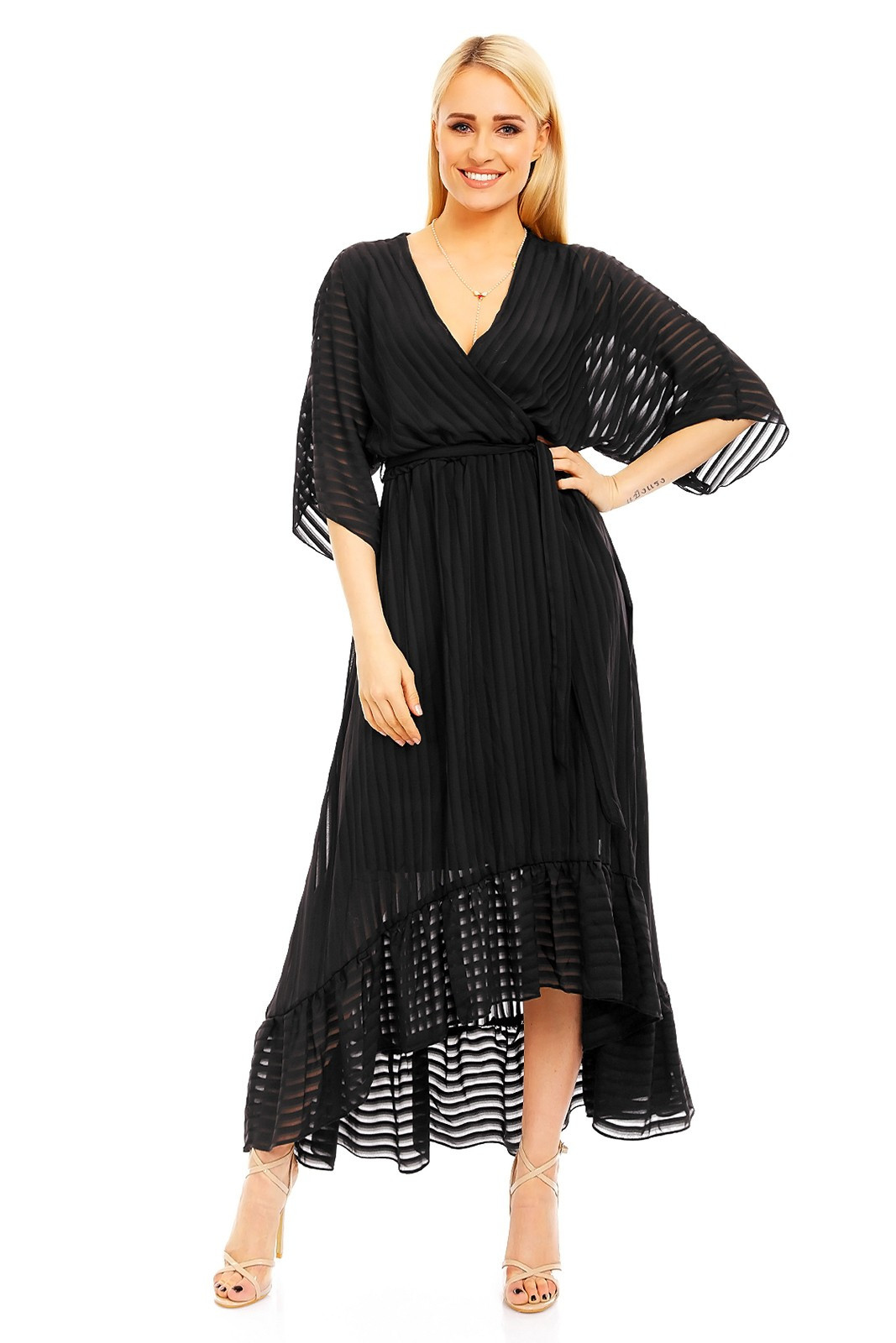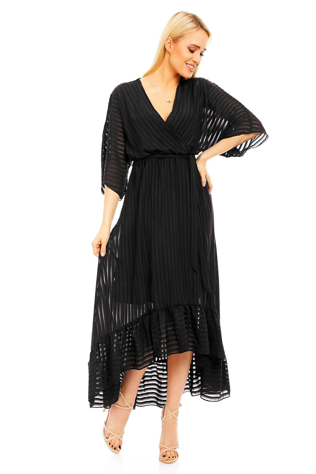 Vzdušné dámské šaty, které se hodí na formální, ale i neformální události. Tento model má výstřih do V a rukávy ve stylu batwings. Součástí šatů je i pásek, který krásně zvýrazní ženský pas. Sukně je dlouhá, ale asymetrická. Spodní lem sukně je ozdoben volánem. Šaty jsou šity jako dvouvrstvé, kdy spodní vrstva je z materiálu, který je neprůsvitný a druhá vrstva je z materiálu, který lehce prosvítá. Oblečte si tyto šaty a pohodlí je zaručeno. Materiál, ze kterého jsou šaty vyrobeny je elastický a příjemný na omak. Kvalitní dámské šaty.