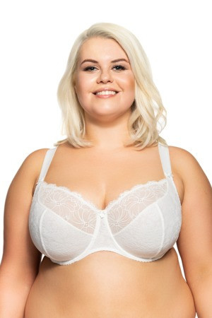 Košíčky z jemné krajky s květinovým motivem, do poloviny podšitá béžovou tkaninou. Hladké boční části, zpevněné svislými kosticemi, ramínka nejsou odepínací.