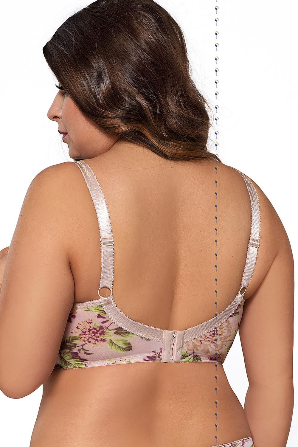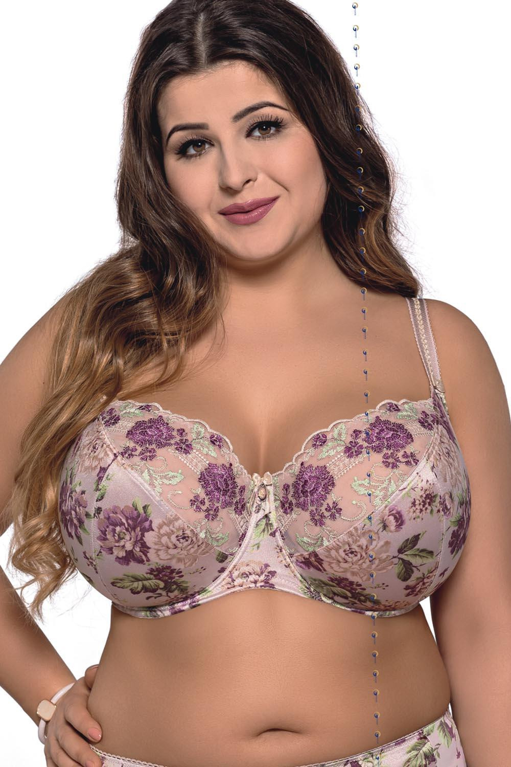 Krásná měkká podprsenka v podzimních barvách - světlé růžové spojené s vřesovou fialovou a zelenou.Košíčky tohoto modelu krásně obepínají poprsí a udržují jej na správném místě. Zároveň vytváří krásný dekolt, který zvýrazňují.Spodní část košíčků je vyrobená z pevnější látky potištěné květinovým motivem. Horní část košíčků pokrývá výšivka, která je podšitá jemnou síťovinou. Můstek tvoří stejná látka, která byla použita na spodní část košíčků. Boky jsou ušité z pružné lycrové látky, která je taktéž potištěná květinovým vzorem a která se při nošení nevytahuje.Ve středu podprsenky, mezi košíčky, je umístěná mašlička s ozdobným přívěskem.Ramínka tohoto modelu je možné nastavit, ale nelze je odepnout. Jejich šířka závisí na rozměru a velikosti podprsenky. V místech, kde se ramínka spojují s košíčky, jsou umístěné malé mašličky a ramínka zdobí aplikace z plastické krajky ve tvaru bublinek.Model je doplněný o svislé boční kostice a zapíná se na dvou nebo třířadové háčky (v závislosti na rozměru) s třístupňovou možností nastavení obvodu.Složení: 90 % polyamid, 7 % elastan, 3 % polyester.