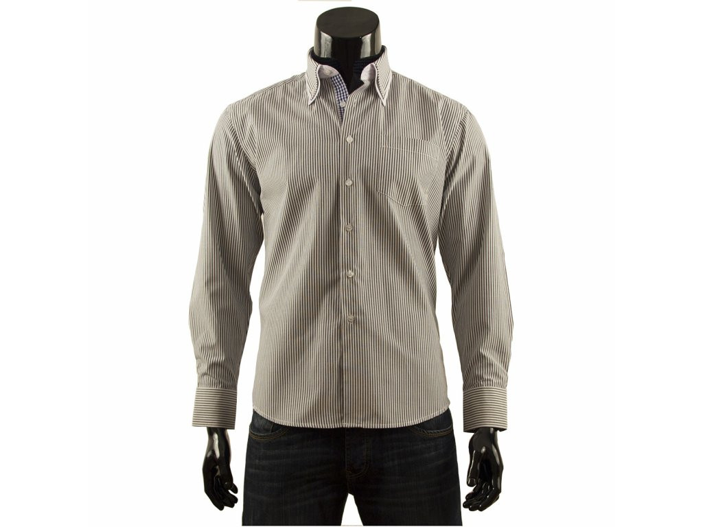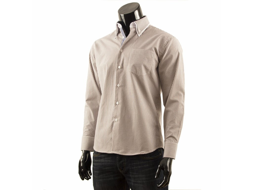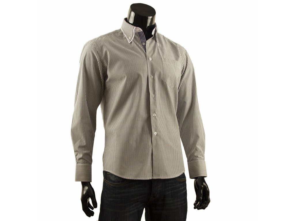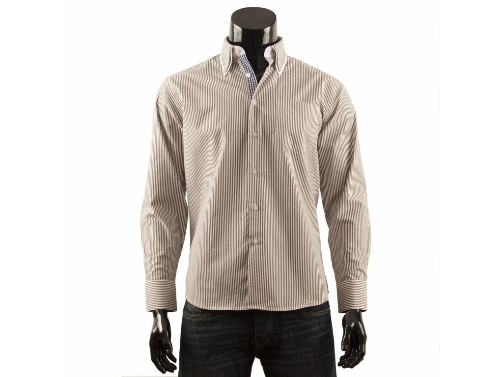 Pánská elegantní košile s dlouhým rukávem a proužky. Košile má dvojitý límeček. Vnitřní strana límce, klopa a vnitřní strany manžet jsou kostkované.