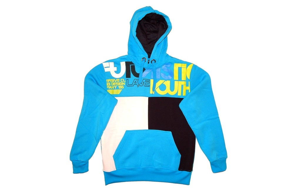 Silná bavlněná pánská mikina. Kapuce je vypodšívkovaná kontrastní textilií. Mikina je vybavena přední kapsou. V dolní části je široký pružný lem, který zajišťuje, aby mikina neprofoukla. Mikina je ušita z několika barevných částí. Kapuce této mikiny je stahovací silnou tkanicí. Mikina je teplá, ideální pro chladnější měsíce v roce (podzim, zima, jaro).