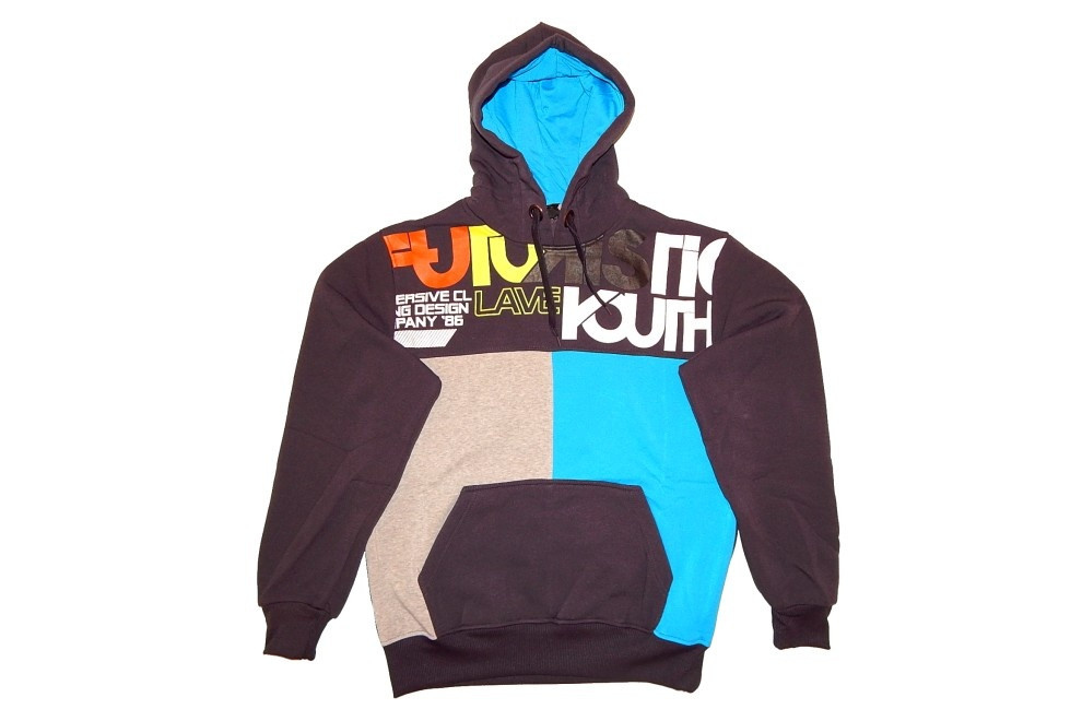 Silná bavlněná pánská mikina. Kapuce je vypodšívkovaná kontrastní textilií. Mikina je vybavena přední kapsou. V dolní části je široký pružný lem, který zajišťuje, aby mikina neprofoukla. Mikina je ušita z několika barevných částí. Kapuce této mikiny je stahovací silnou tkanicí. Mikina je teplá, ideální pro chladnější měsíce v roce (podzim, zima, jaro).
