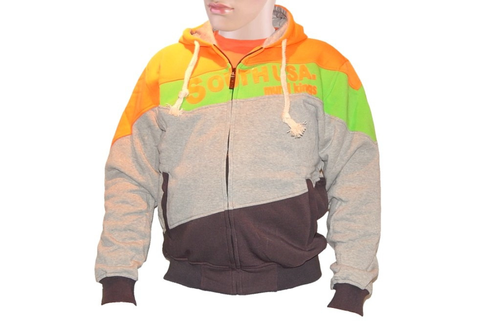 Kvalitní silná a teplá pánská mikina, bavlněná (90% bavlna) s kapucí vypodšívkovanou kontrastní barvou tkaniny a zapínáním na zip. V přední části je mikina vybavena zipem, dvěma kapsami a v dolní partii je silný pružný lem, který zajišťuje obemknutí těla proti profouknutí. Mikina je ušita z několika různých barev tkaniny a z rubu je fleece úprava s jemným chlupem pro příjemné nošení. Kapuce mikiny je stahovací silným provázkem. Mikina je teplá, ideální pro podzim, zima, jaro, na hory, nebo na běžné volnočasové nošení v chladnějších měsících.