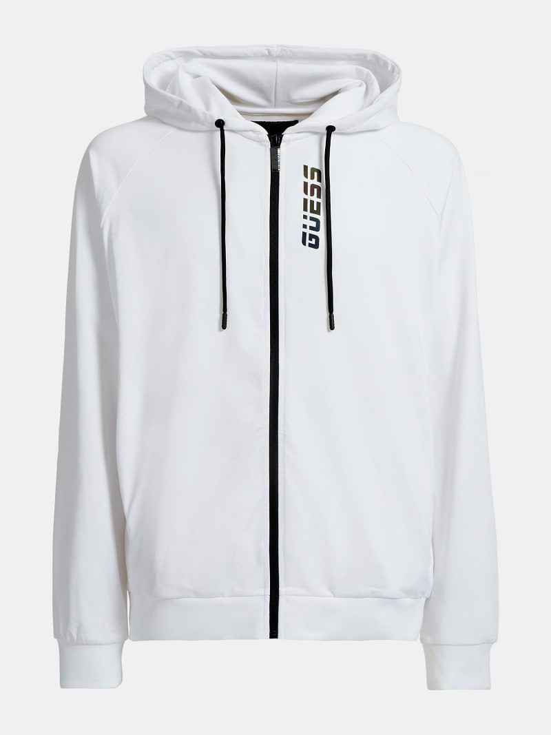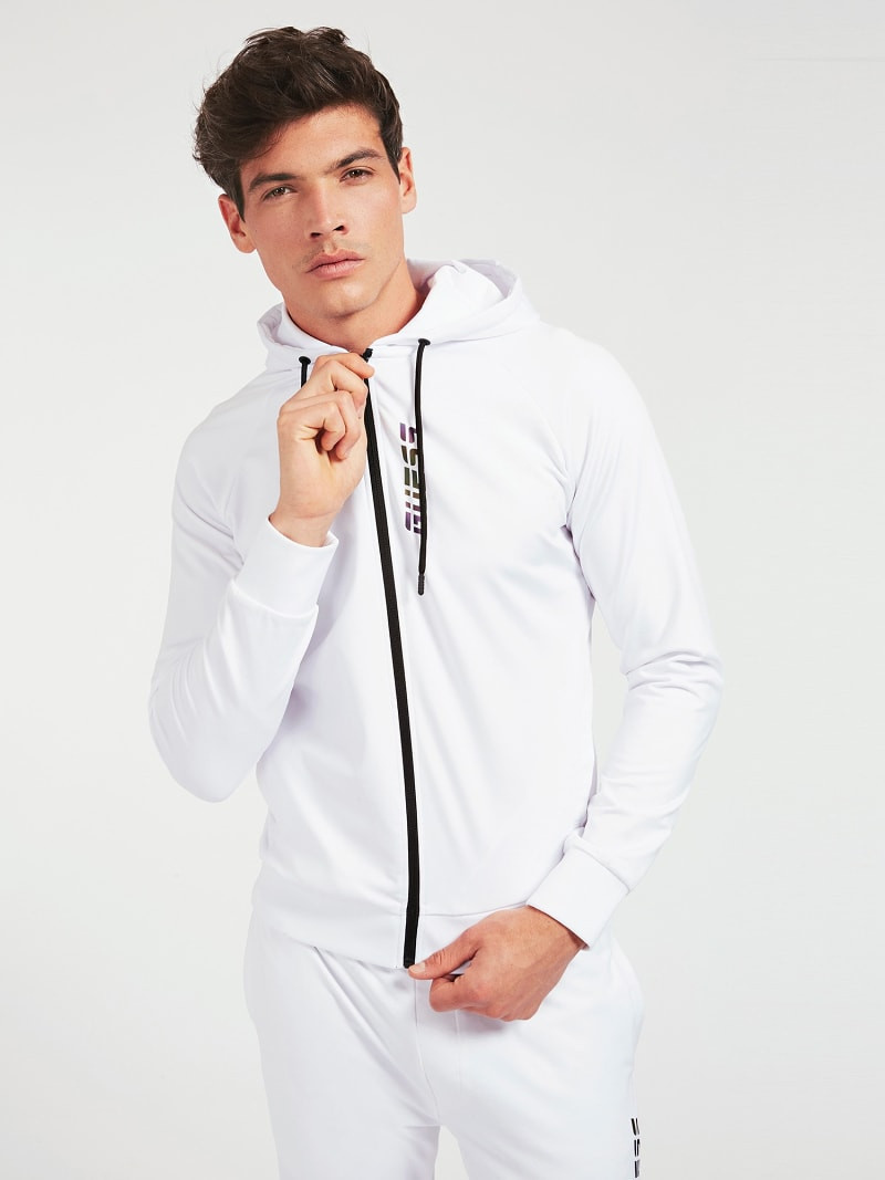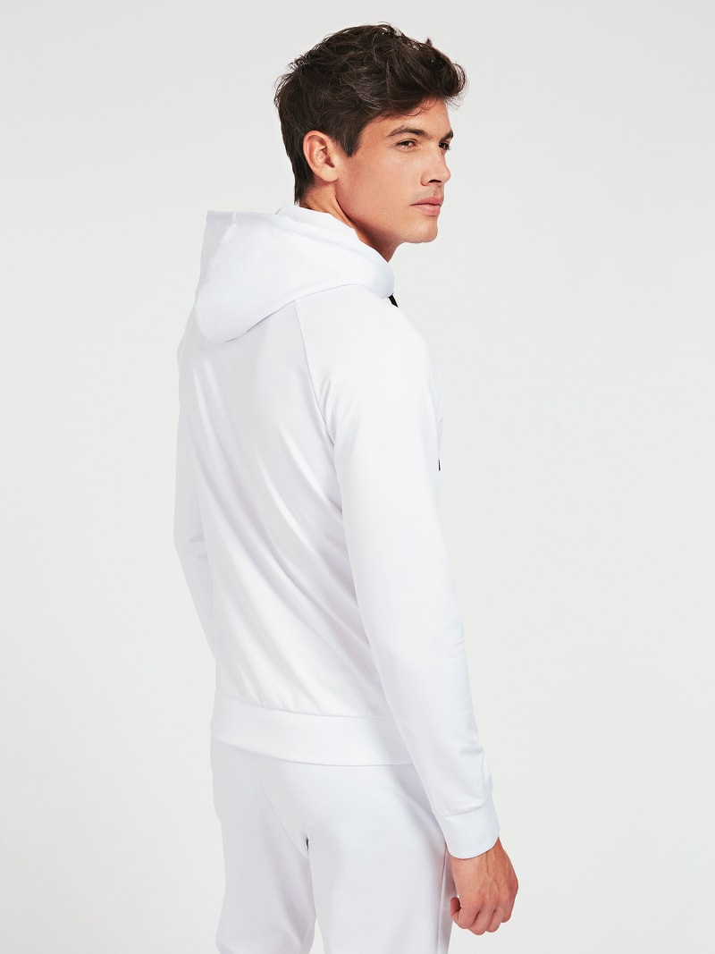 Stylová pánská mikina v bílé barvě na zip s kapucí a logem na přední straně.
