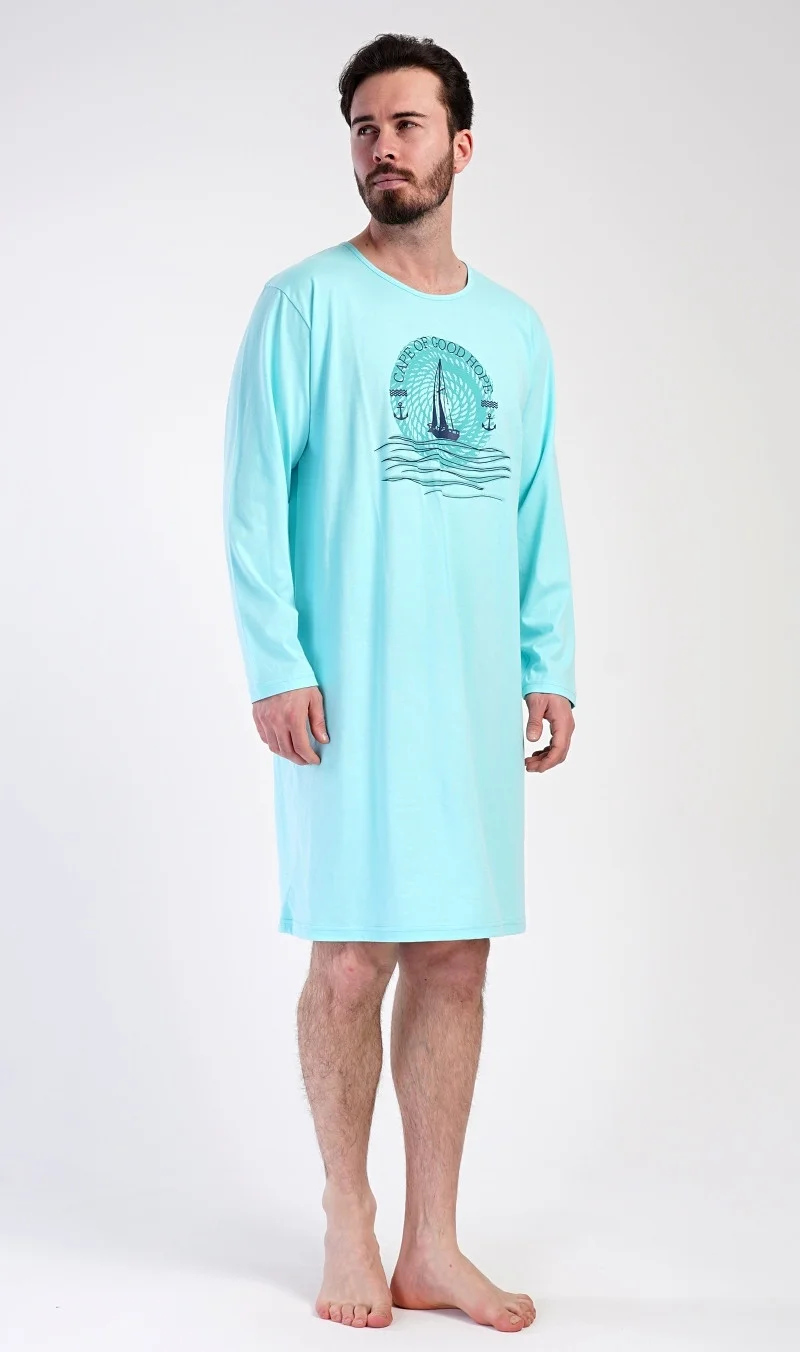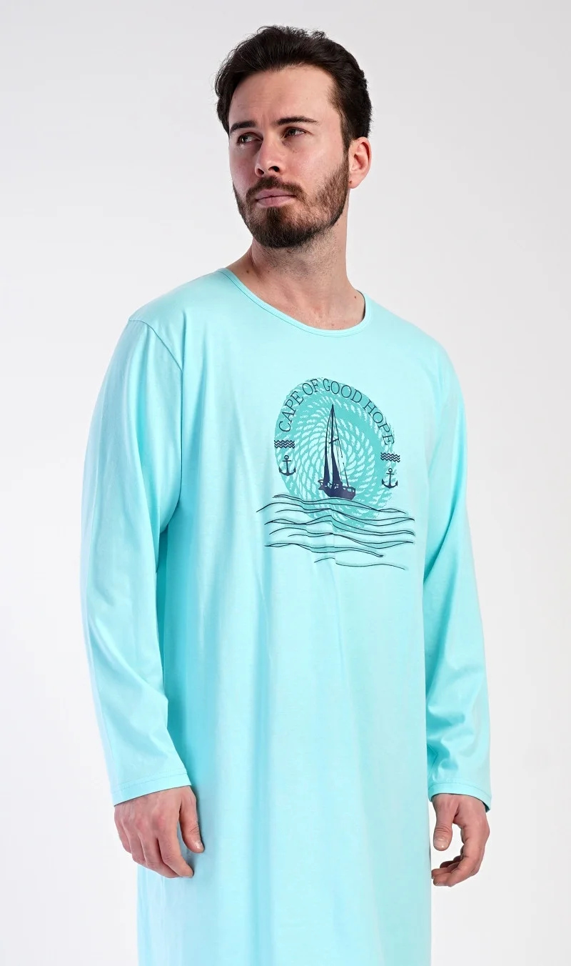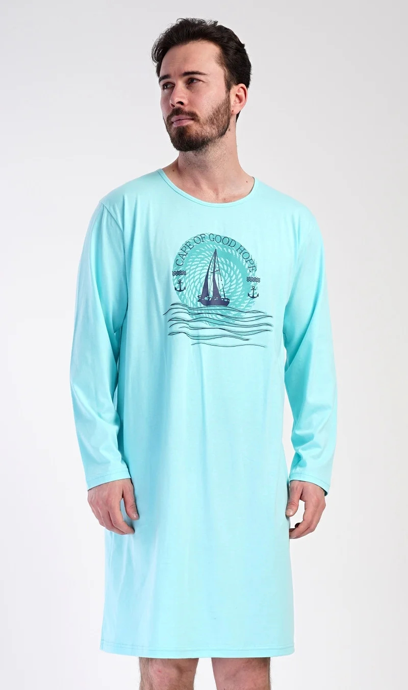 Pánská bavlněná noční košile s dlouhým rukávem Jachting. Jednobarevná pánská noční košile s kulatým výstřihem a délkou po kolena má na hrudi obrázek plachetnice a nápis 'Cape of good hope'. Noční košile je vhodným dárkem pro všechny milovníky moře a dálek. Použitý materiál s obsahem bavlny 100% je příjemný a poddajný na dotek.