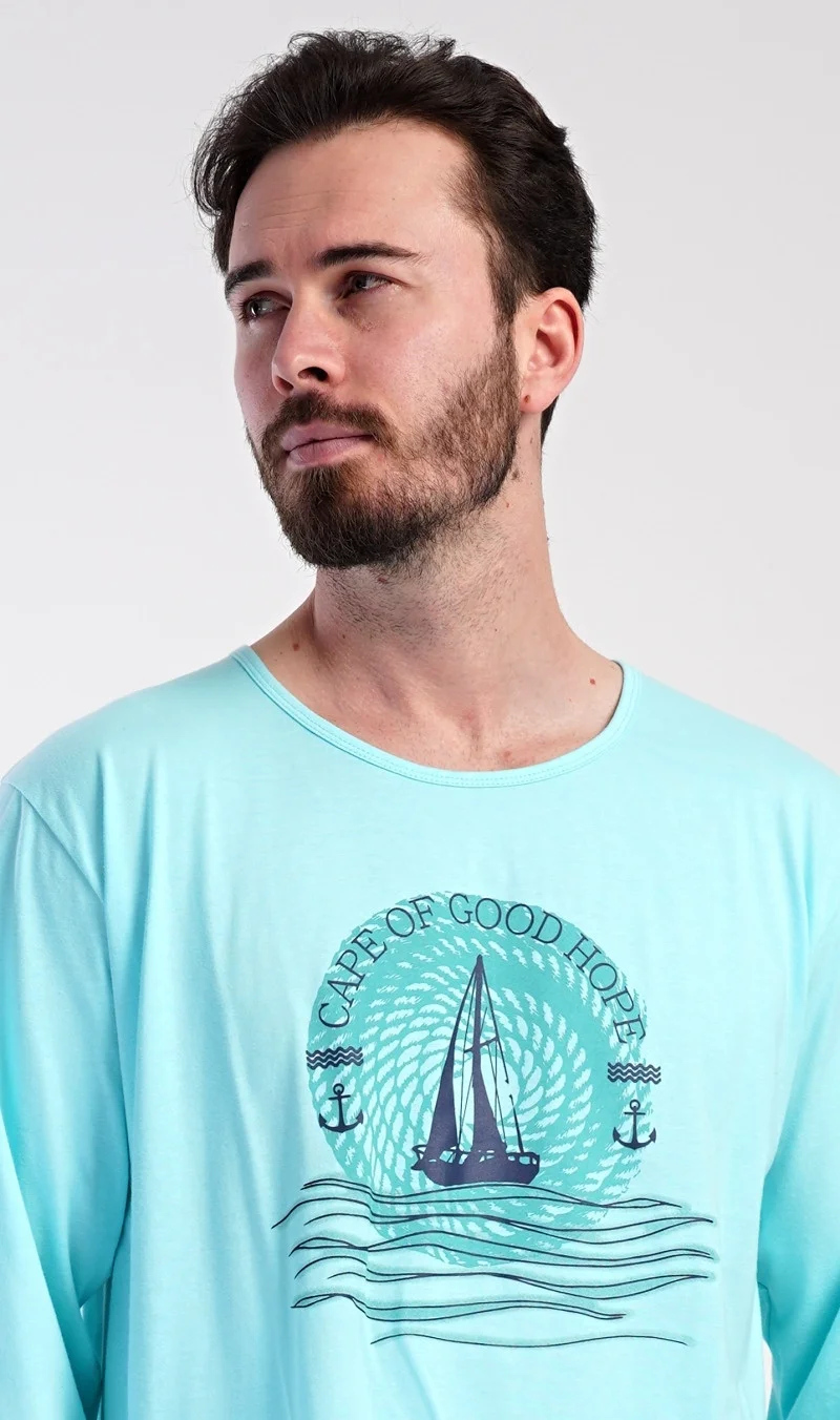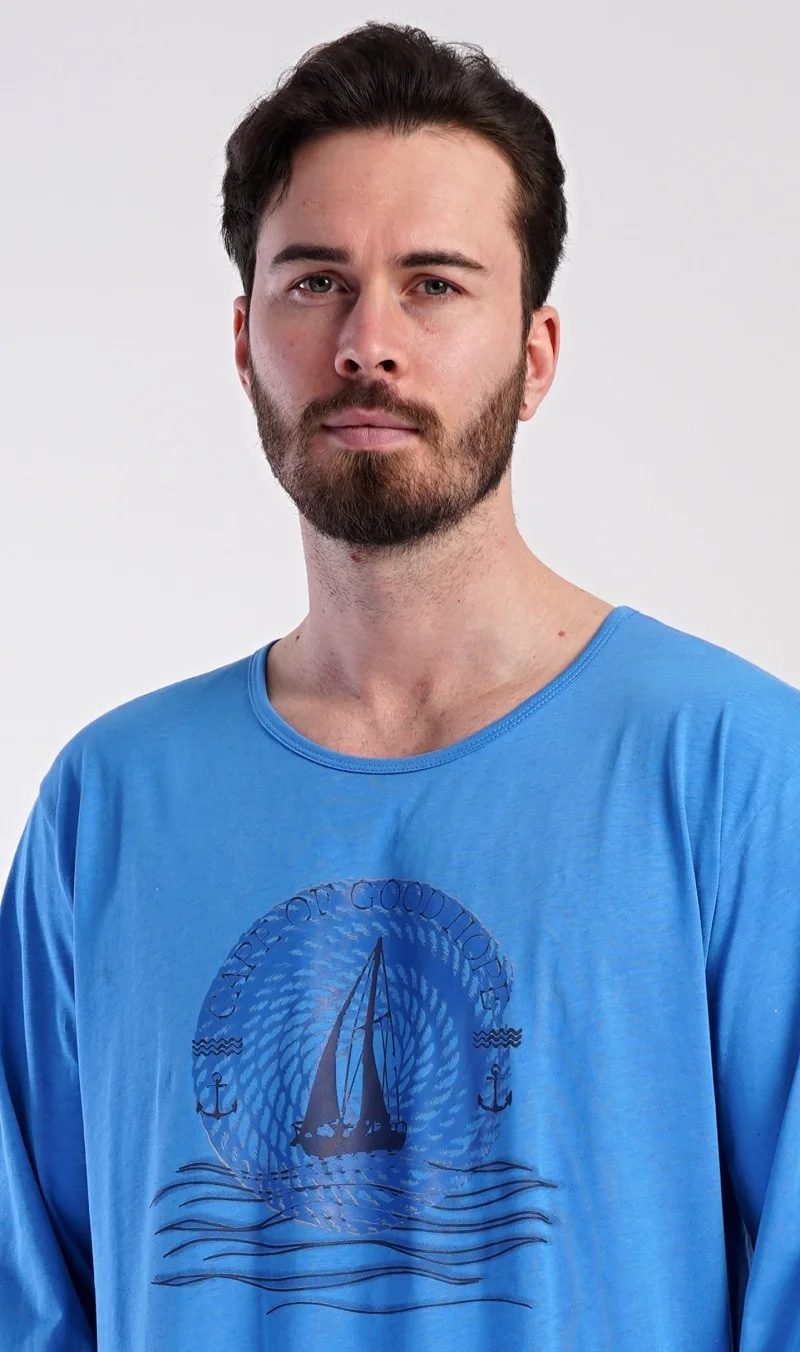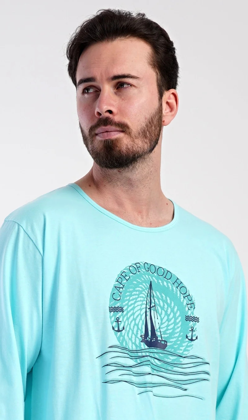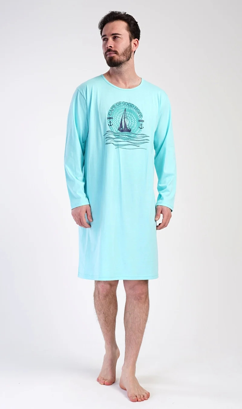 Pánská bavlněná noční košile s dlouhým rukávem Jachting. Jednobarevná pánská noční košile s kulatým výstřihem a délkou po kolena má na hrudi obrázek plachetnice a nápis 'Cape of good hope'. Noční košile je vhodným dárkem pro všechny milovníky moře a dálek. Použitý materiál s obsahem bavlny 100% je příjemný a poddajný na dotek.