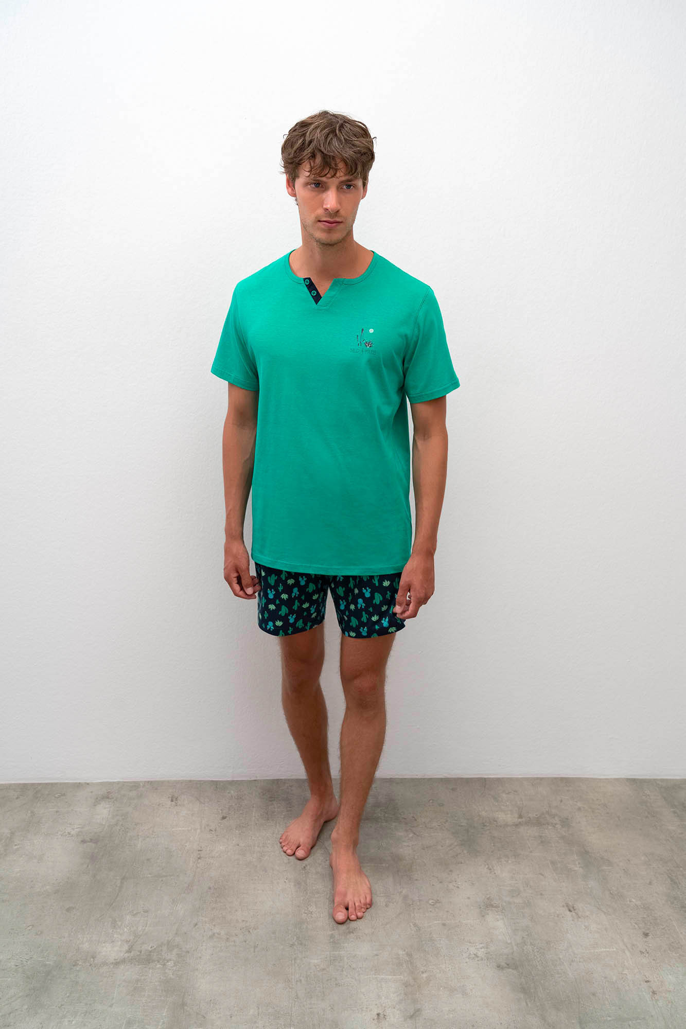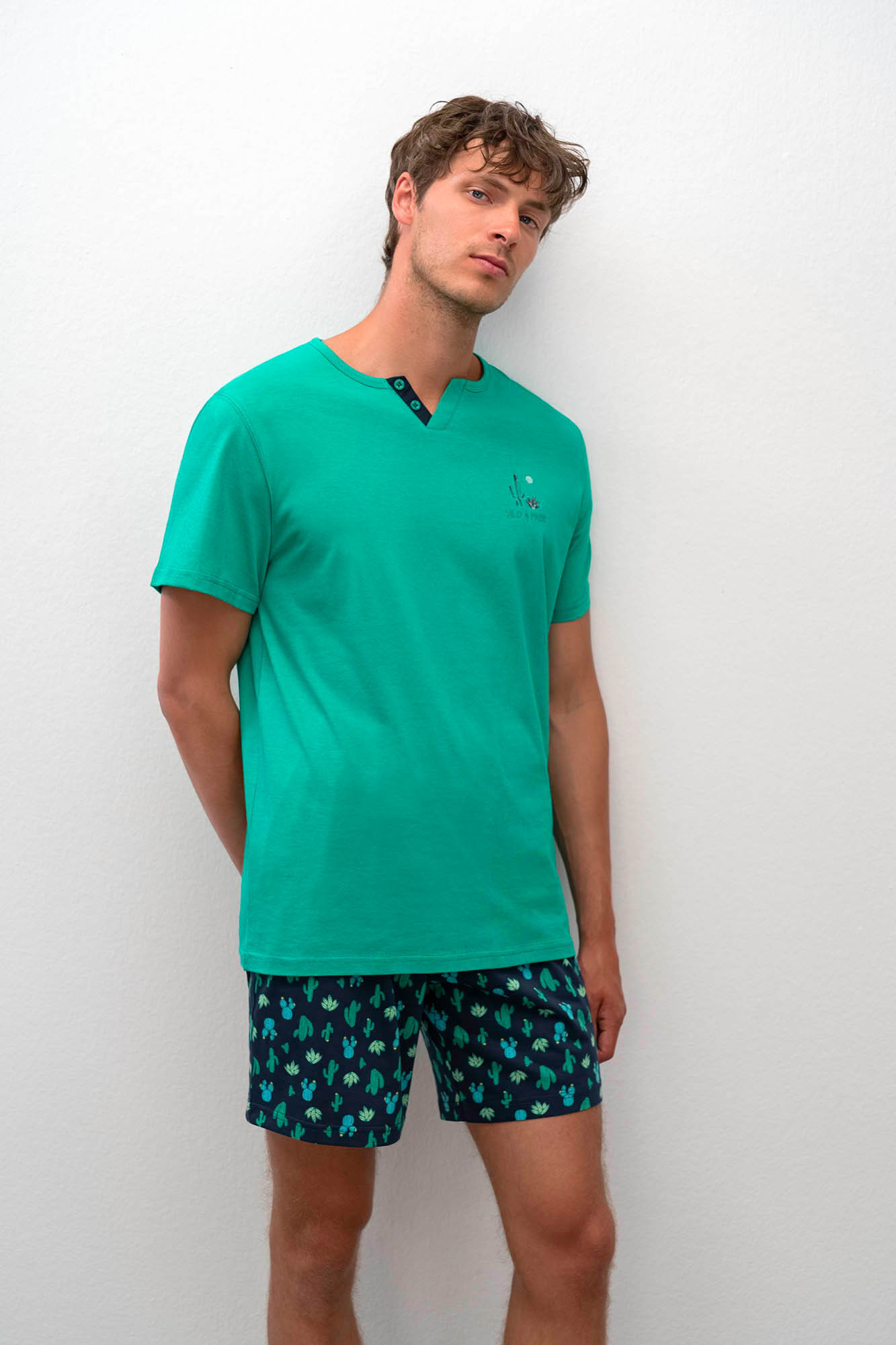 Pánské krátké pyžamo, vrchí díl jednobarevný, u krku knoflí, spodní díl barevný s potiskem kaktusů.