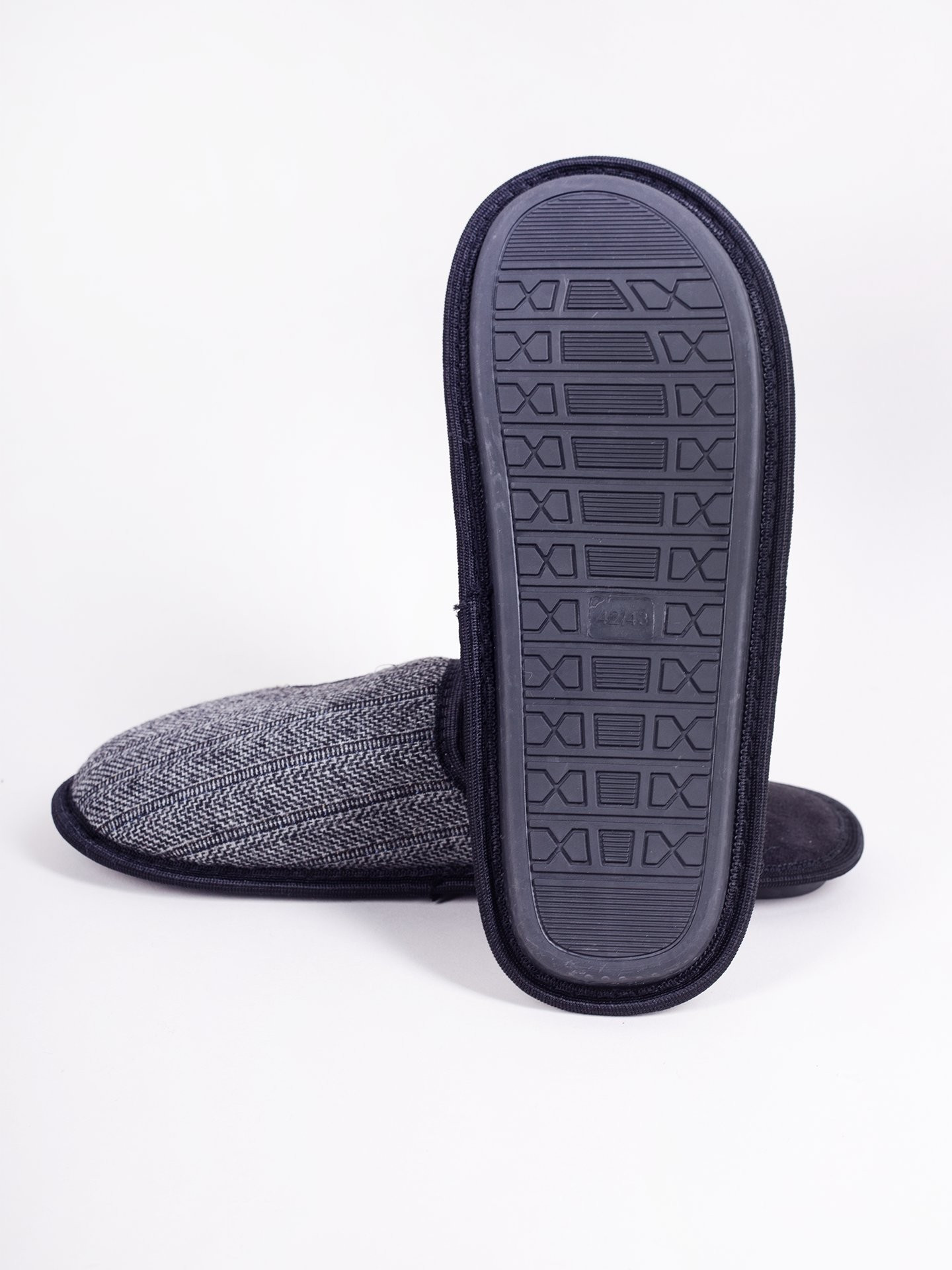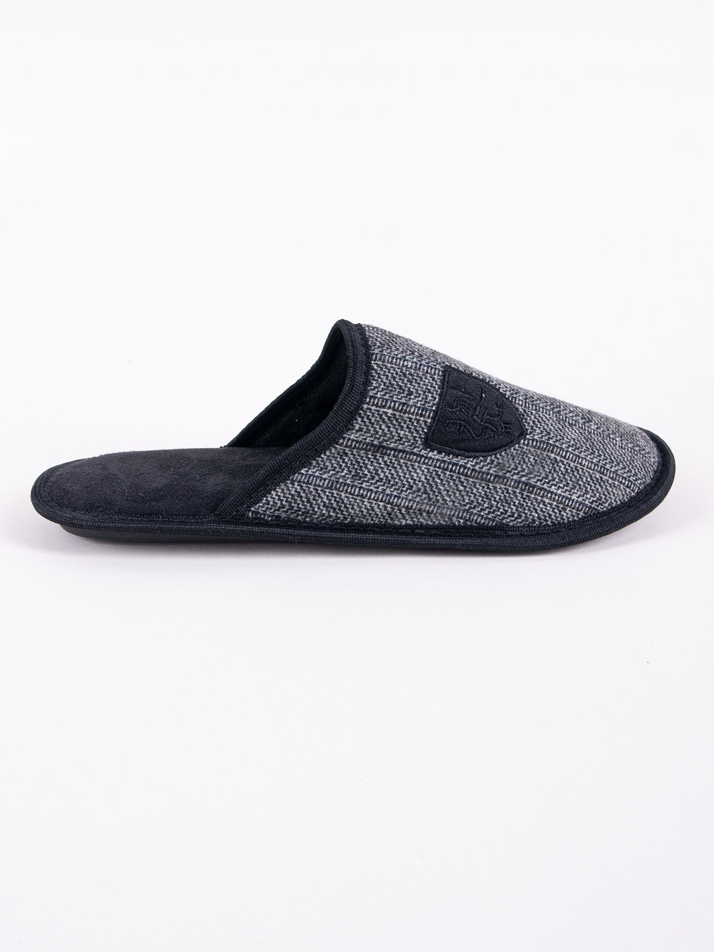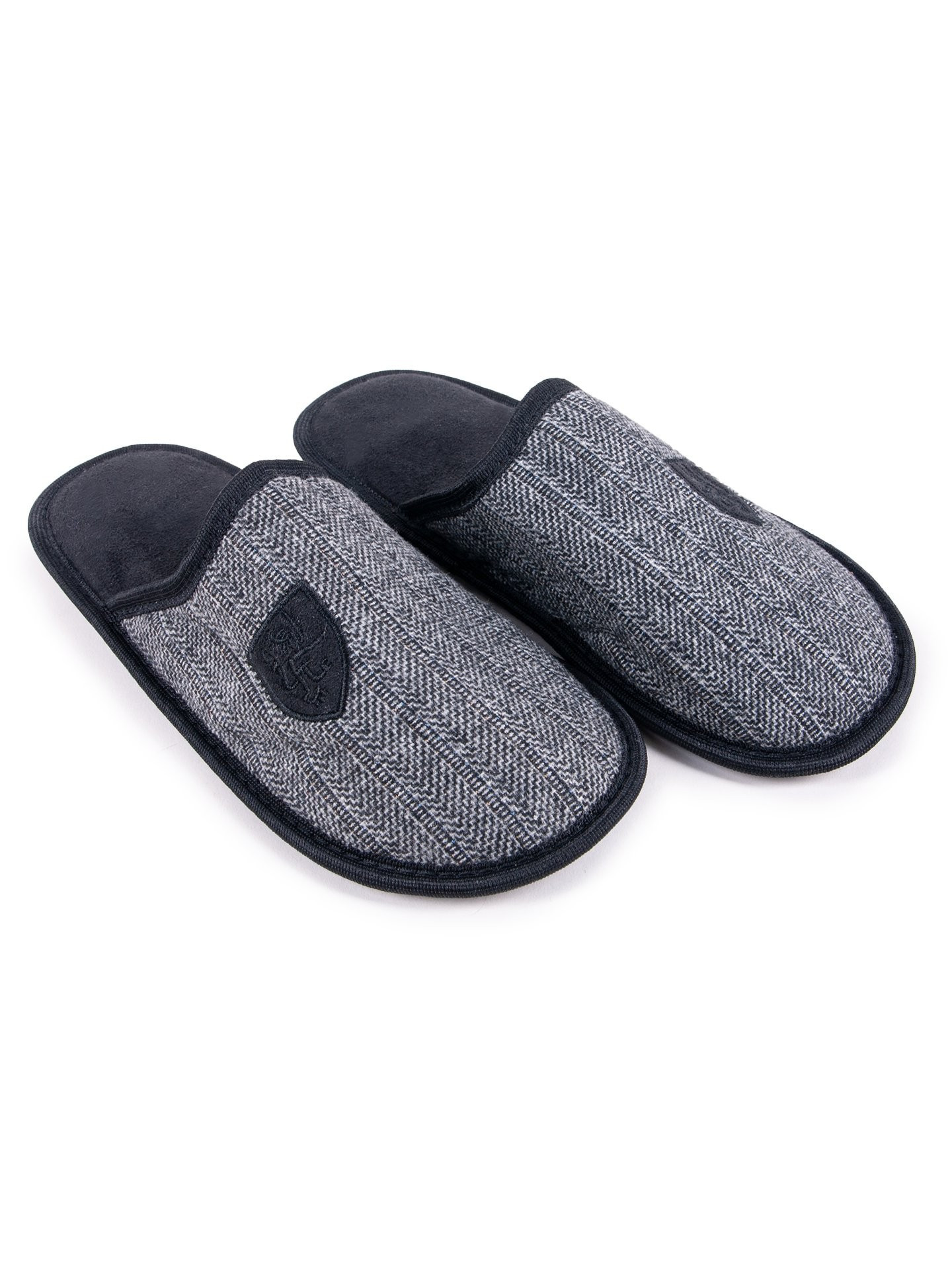 Pánské domácí pantofle v univerzální černé barvě. Vzor rybí kosti na přední straně. Nazouvací, se zakrytými špičkami. Jsou praktické a pohodlné. Uvnitř jsou polstrované příjemným materiálem. Mají stabilní podrážku, takže se velmi pohodlně nosí. Ideální pro každého muže, který ocení pohodlí a styl. Jsou ideální pro každodenní domácí použití v chladnějších dnech.
