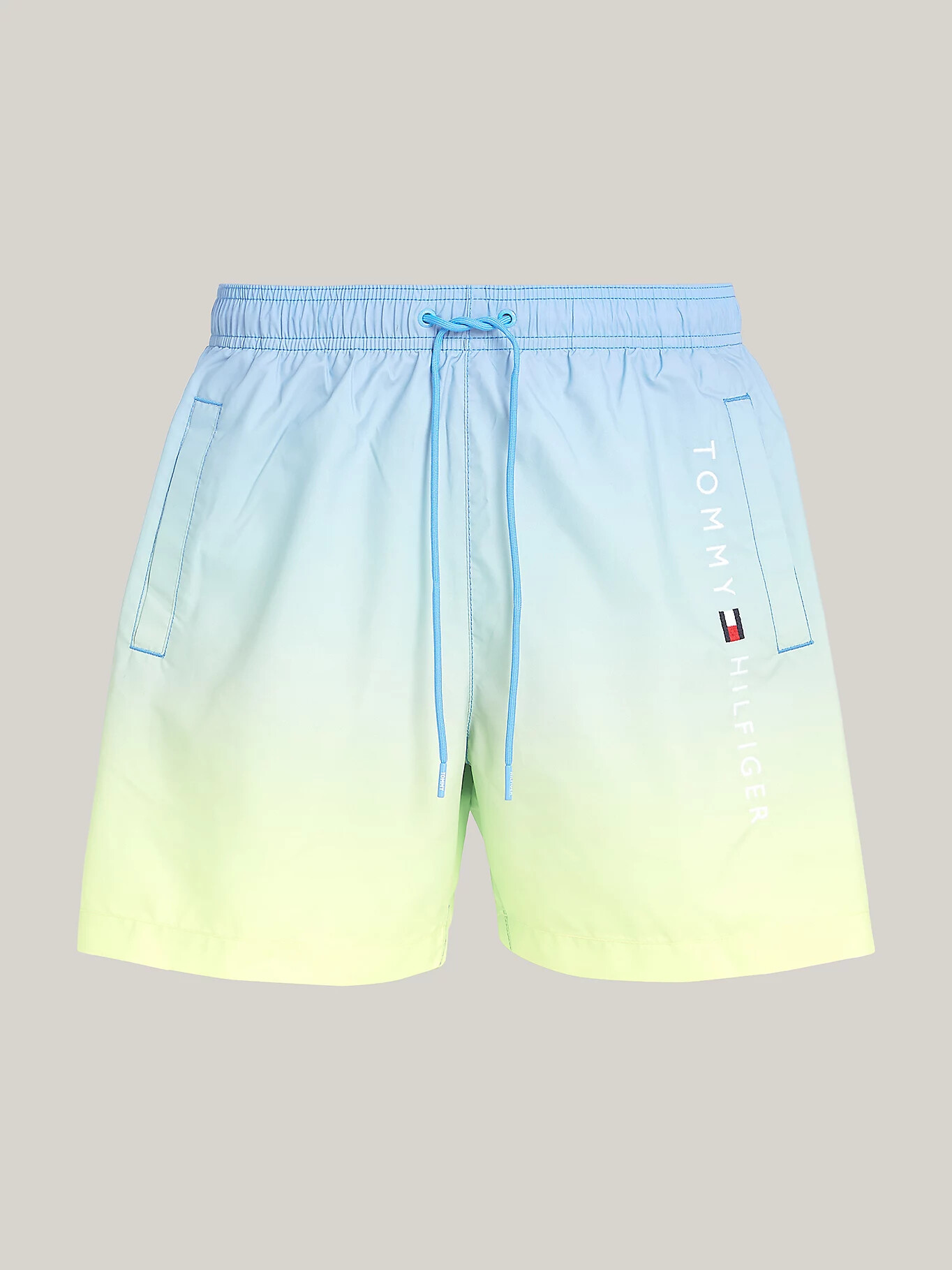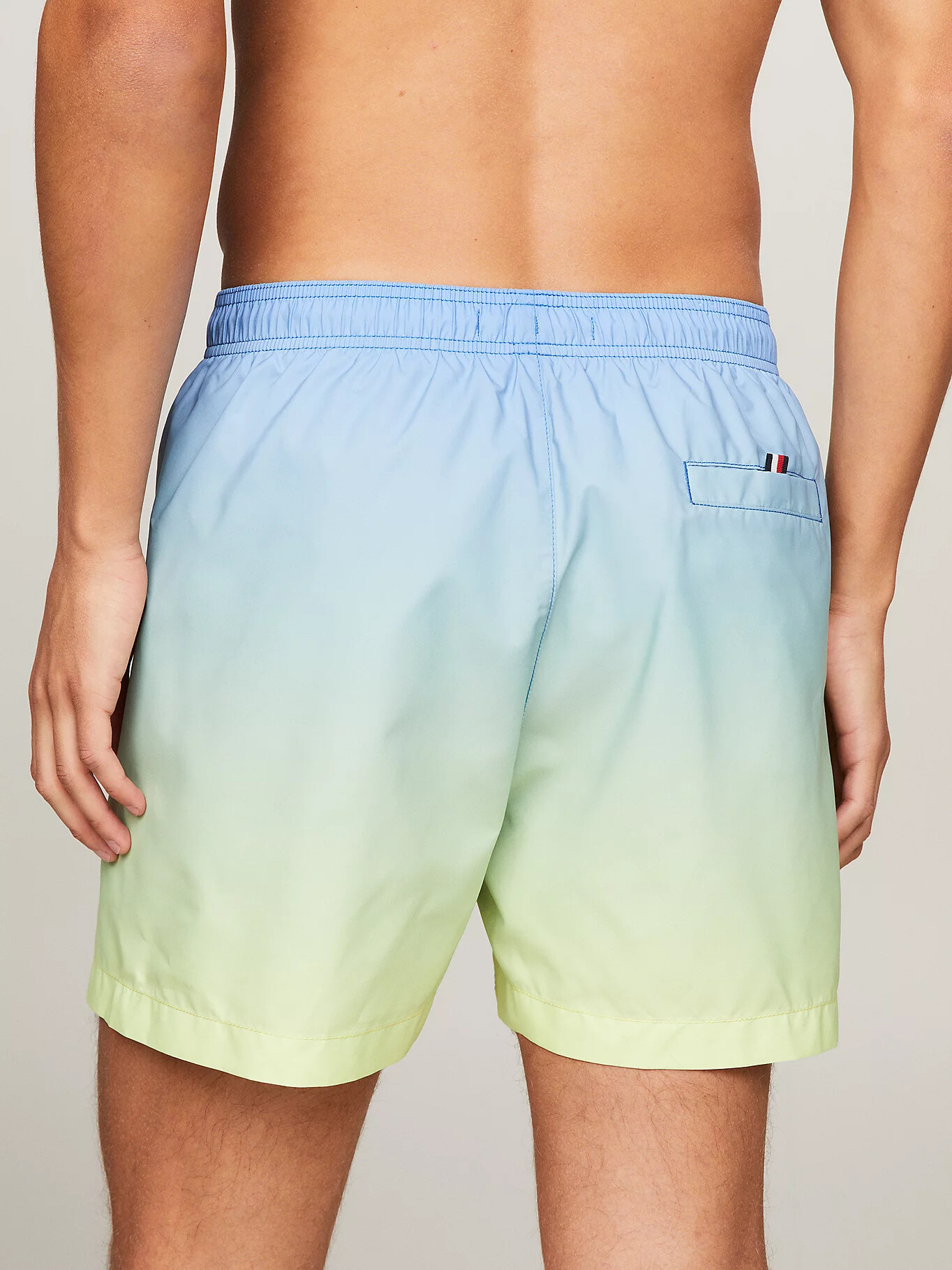 Objevte jemnost ombré potisku v těchto stupňovitých plaveckých šortkách se stahovací šňůrkou v pase a pohodlnou síťovanou podšívkou.