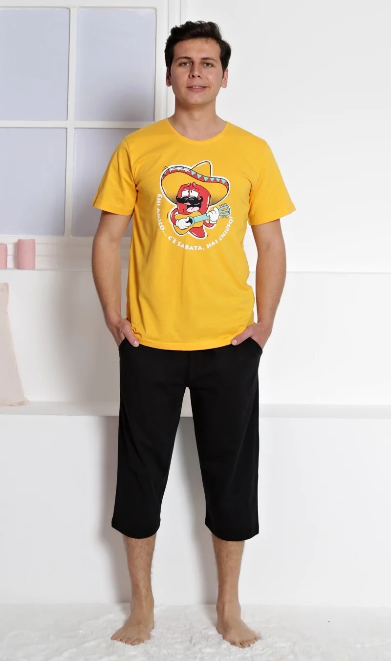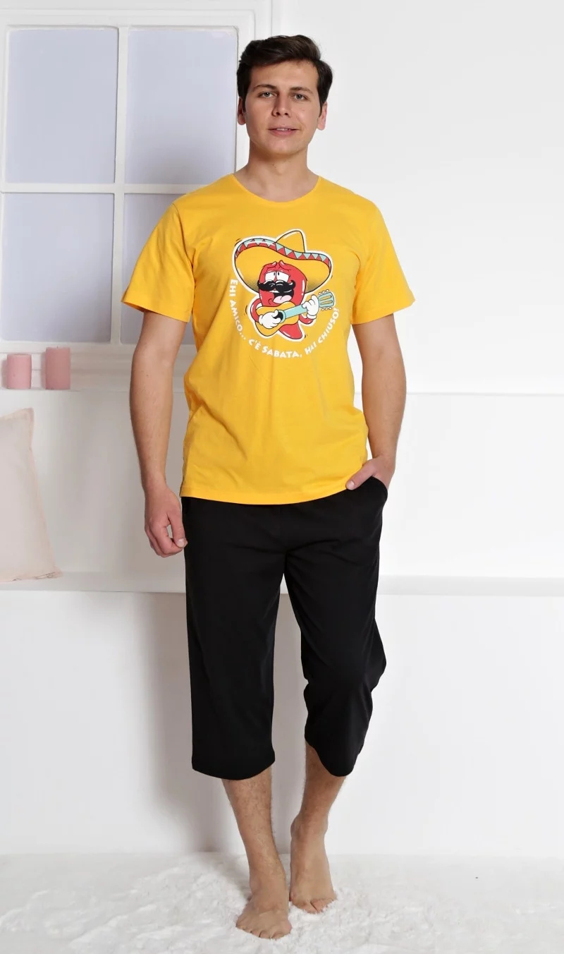 Pánské pyžamo kapri Mexiko. Pánské pyžamo kapri se skládá z trička s krátkým rukávem a tříčtvrtečních kalhot. Na jednobarevném tričku je chilli paprička s obrovským sombrérem a mexickým nápisem hrající na kytaru. Výrazné tričko vhodně doplňuují jednobarevné kalhoty. Použitý materiál je jemný a podddajný na dotek. Pyžamo je vhodné na denní nošení.