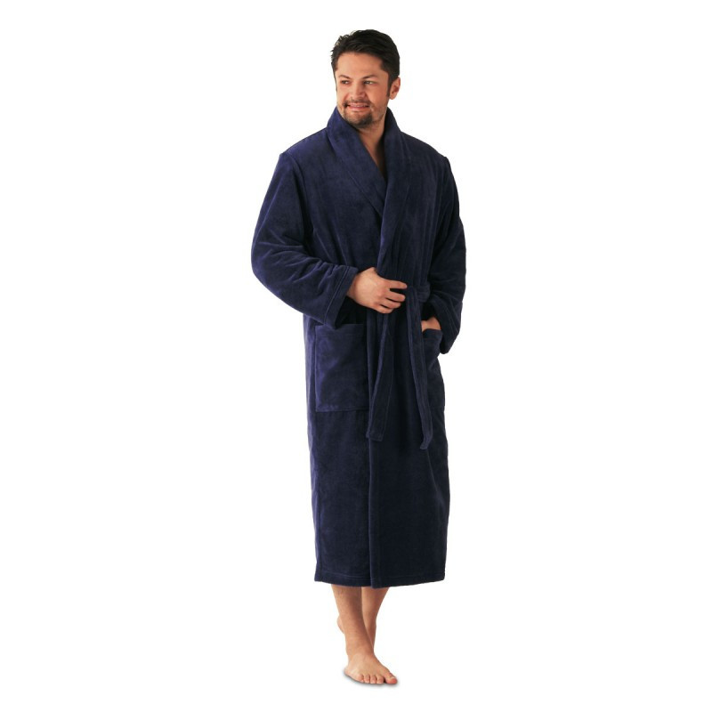 Pohodlný dlouhý koupací plášť klasického střihu s šálovým límcem poskytuje dokonalý komfort pro volné chvíle.