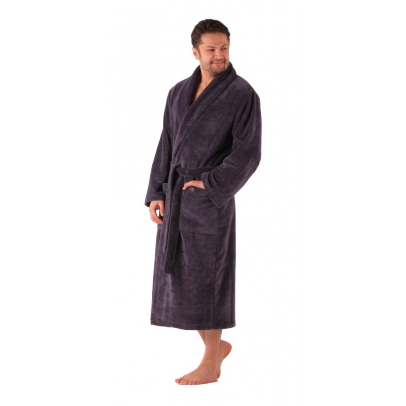 Dlouhý pánský župan tradiční české značky VESTIS. Kombinace bavlněného froté na vnitřní straně a jemného mikrovlákna na velurové vnější straně