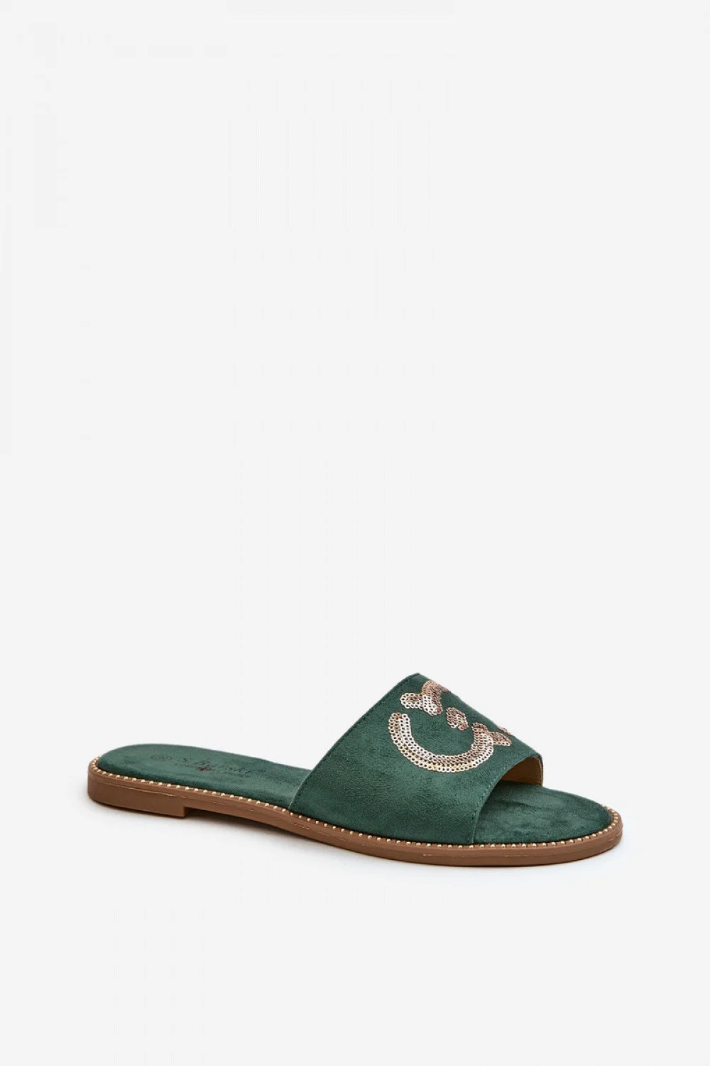 Dámské žabky byly vyrobeny z ekologického semiše. Jsou posazené na plochém podpatku. Ozdobné flitry na pásku dodávají na přitažlivosti. Měkká stélka Comfort vám umožní pohodlné nošení i po celý den. Skvěle se hodí k ležérním outfitům!