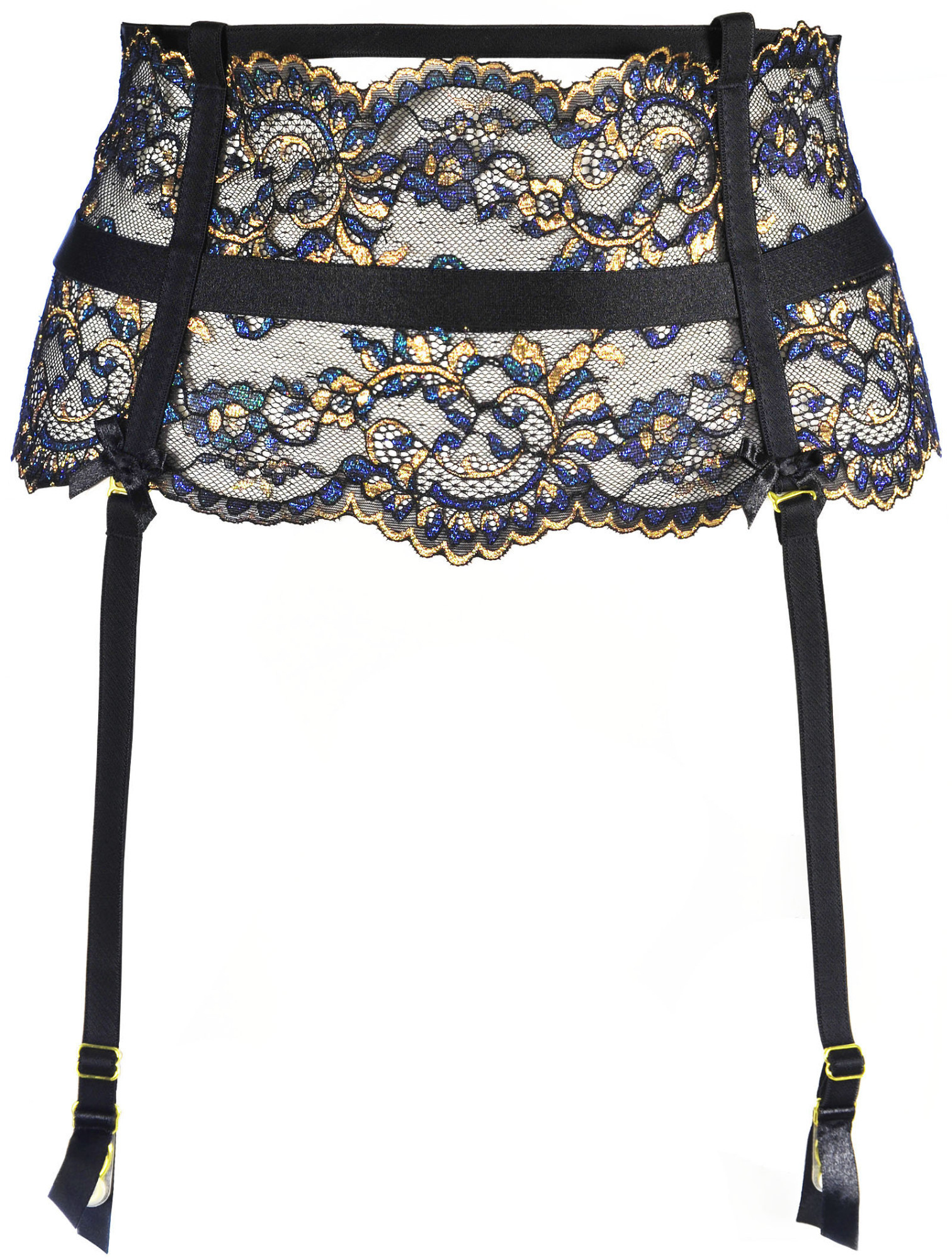 Pohádkové vzory třpytivé modré krajky jsou jedinečným doplňkem pro každou ženu. Seznamte se s naším bestsellerem - podvazkovým pásem V-10362, který je vyroben z elastické krajky, obepíná břicho a záda a je podepřen systémem pásků zdobených kovovými zlatými doplňky. Má nastavitelný obvod na zádech, dvojité zapínání na háčky a oči a kostice.