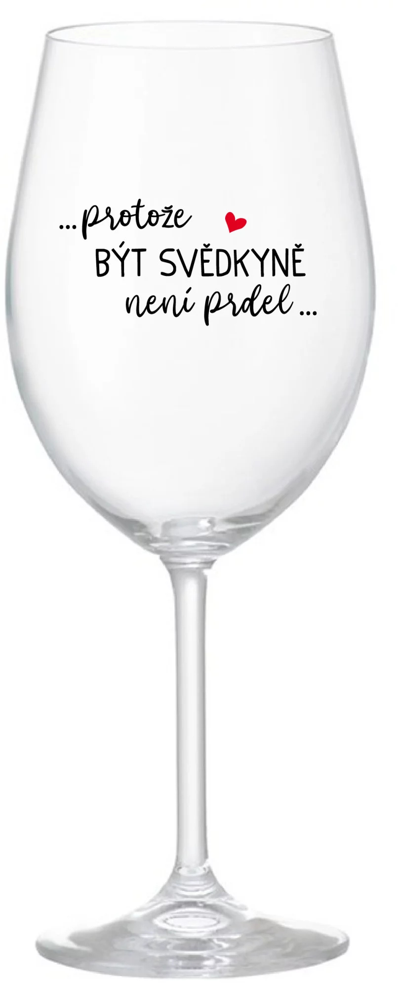 Vinná čirá sklenice s originálním motivem ...PROTOŽE BÝT SVĚDKYNĚ NENÍ PRDEL... je krásným a osobitým dárkem, které ale využijete i Vy sami třeba ve chvílích, kdy si budete chtít zpříjemnit náročný den. Tyto originální vinné sklenice jsou totiž nejen pro výjimečné události, ale i pro běžné večery, které si chcete zpříjemnit sklenkou dobrého vína. Jistě proto potěší každého milovníka vína, i toho, kdo si umí svůj život vychutnat plnými doušky.