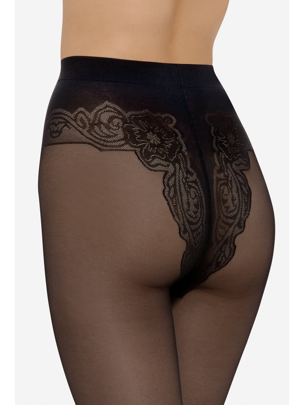Dámské punčochové kalhoty vyrobené z mikrovlákna. Neprůhledné, matné. S úžasnými, žakardovými kalhotkami s malým klínem.