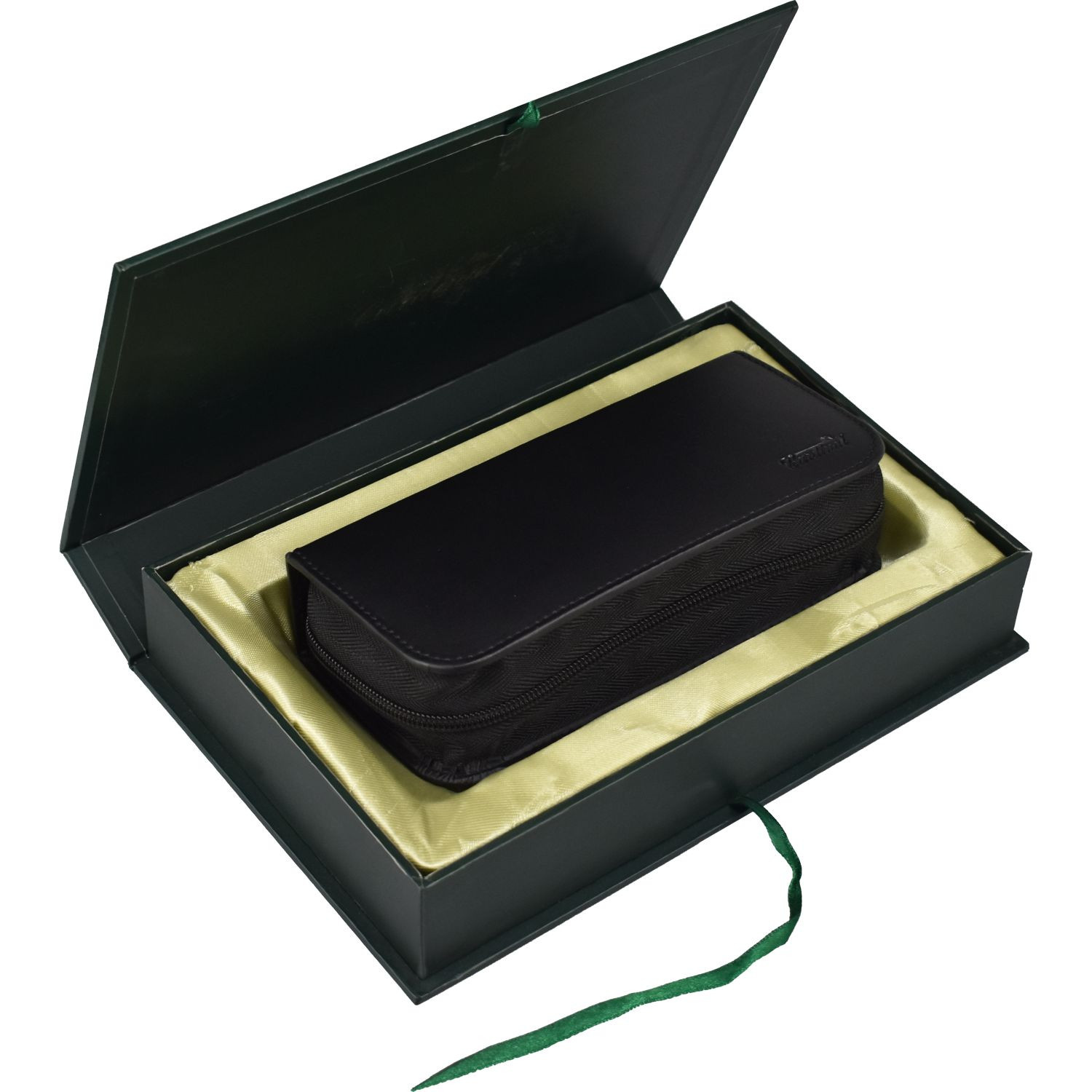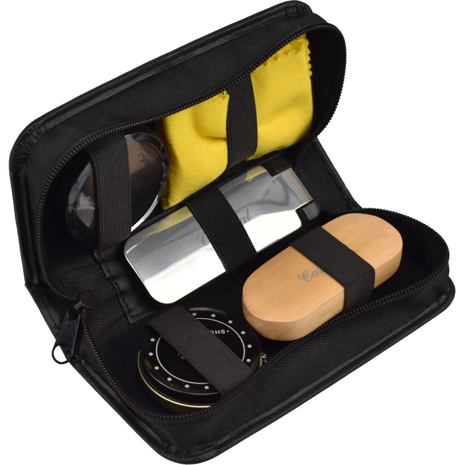 Uzavírá se na zip, v černém koženém pouzdře, dárková krabička obsahuje: 2 x krém na boty (hnědý, černý), kartáč na boty, leštící hadřík, velikost: 17,5x8,5x5 cm.