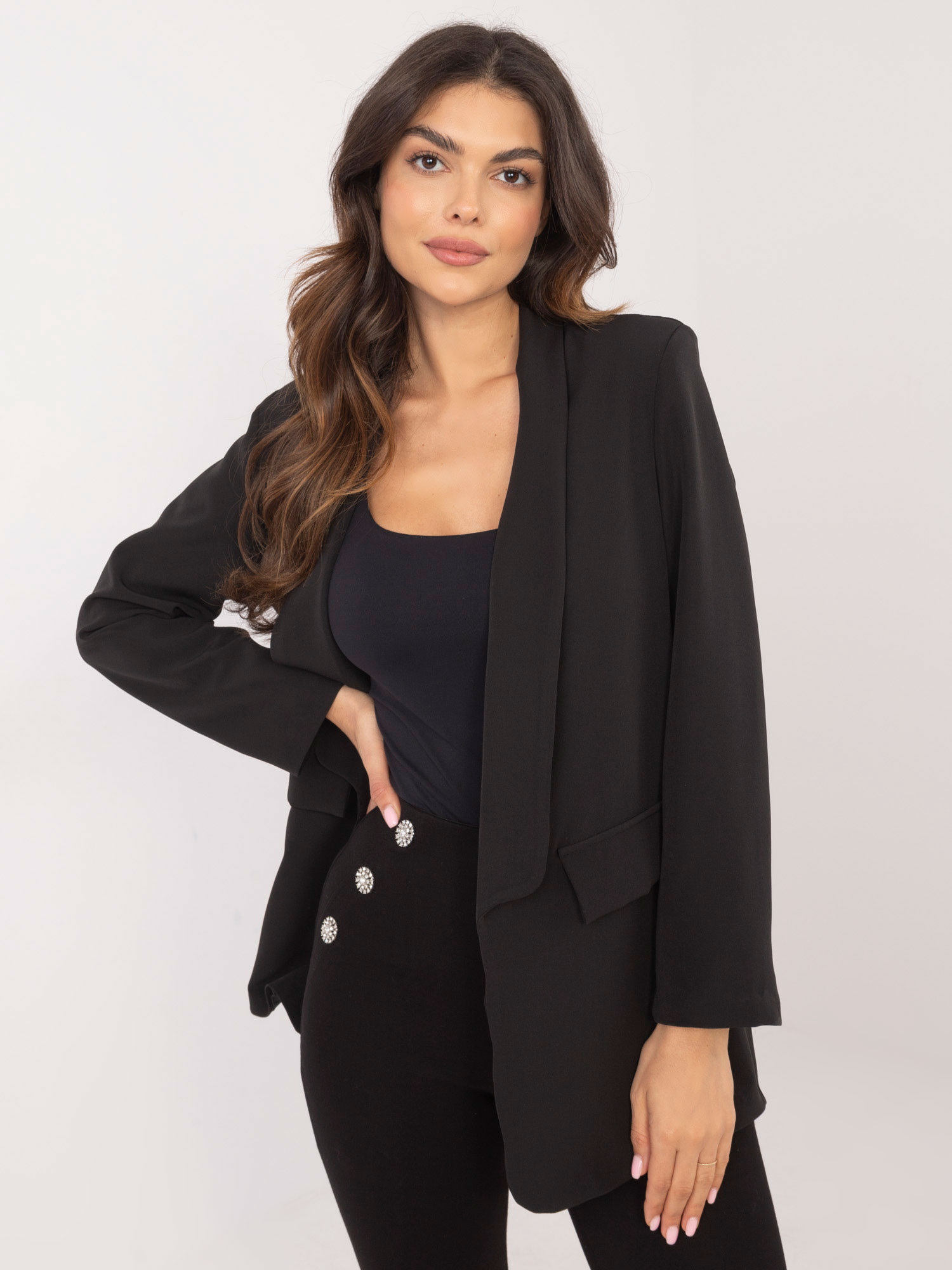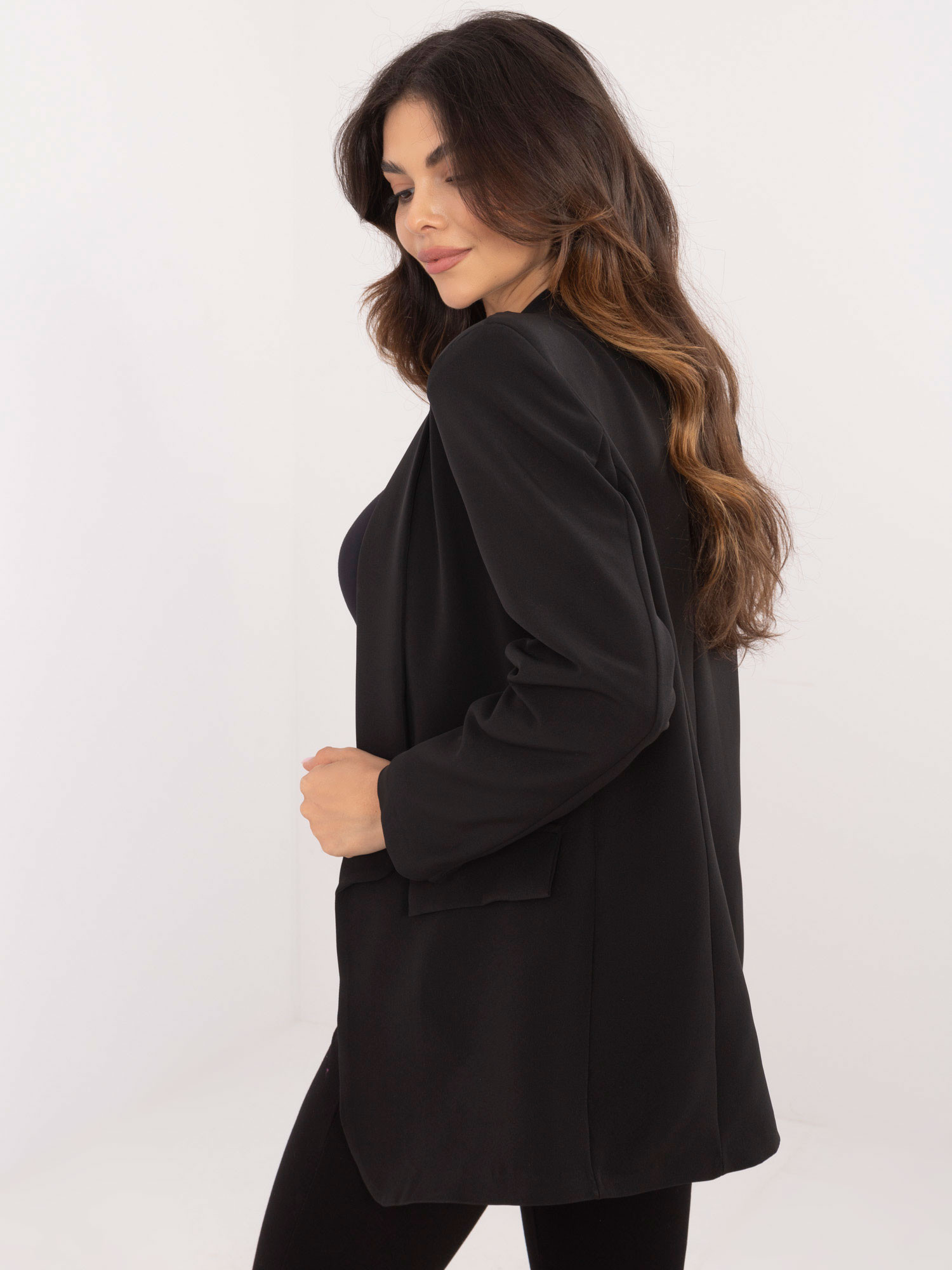 Dámské delší sako bez knoflíků, s našitými klopami místo kapes. Saténová podšívka.