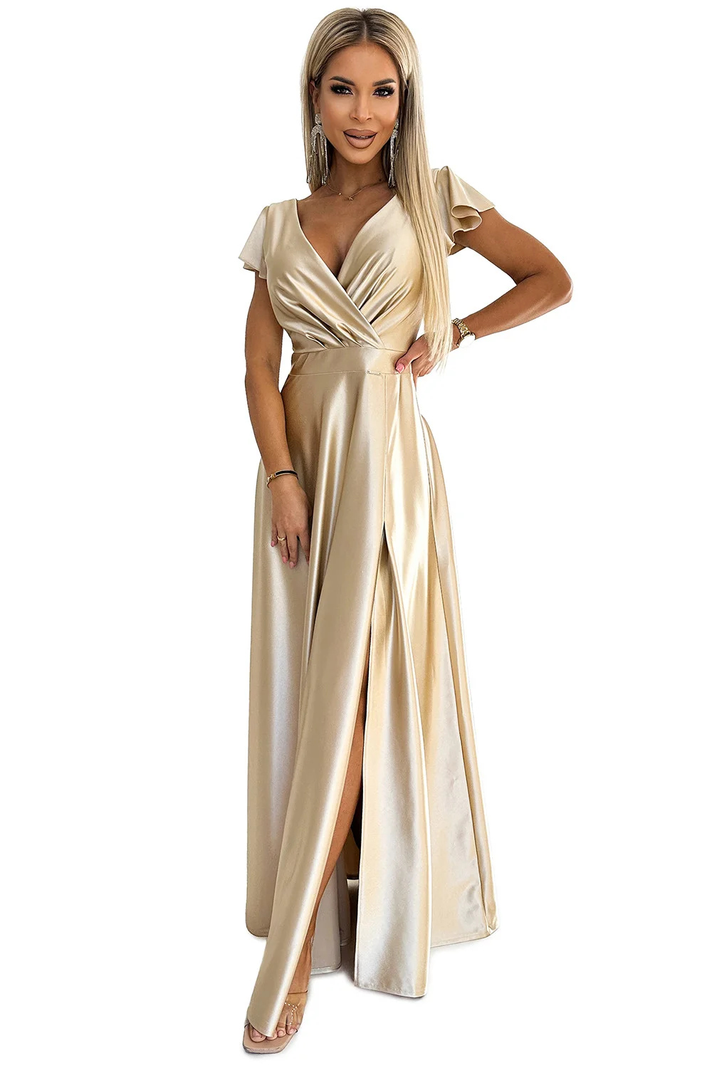 CRYSTAL - dlouhé saténové maxi šaty s obálkovým výstřihem a rozparkem na noze. barva: zlatá - béžová. šaty krásně odhalují dekolt a skvěle padnou do tance. zapínají se vzadu na krytý zip. polský výrobek. značka numoco.