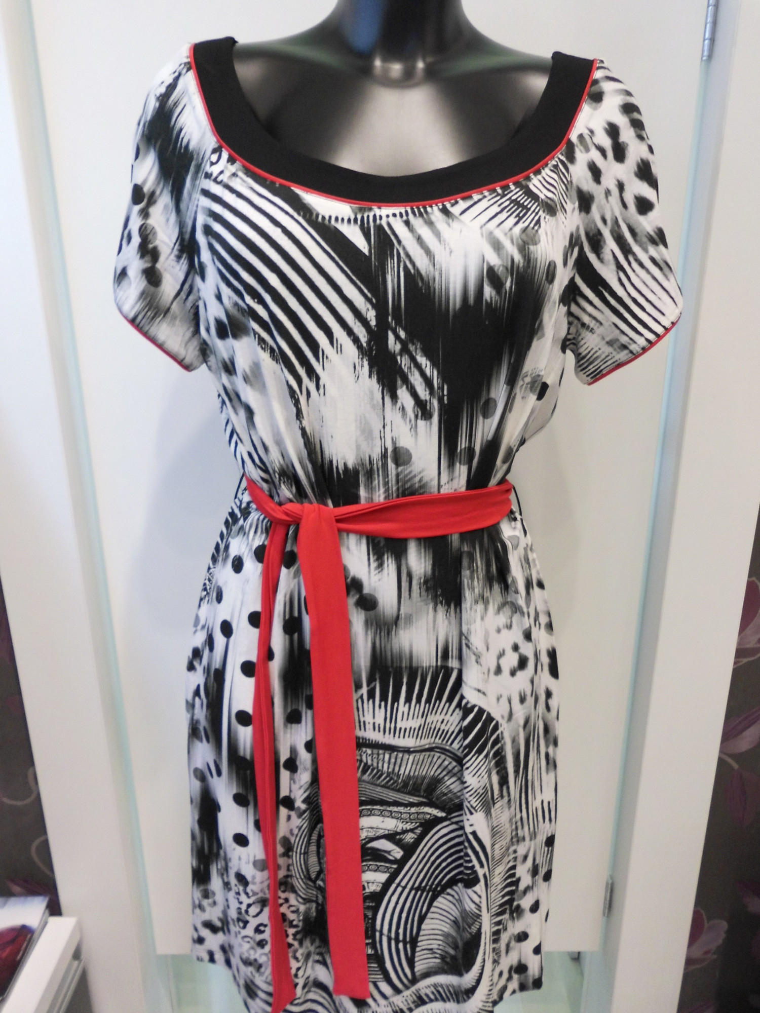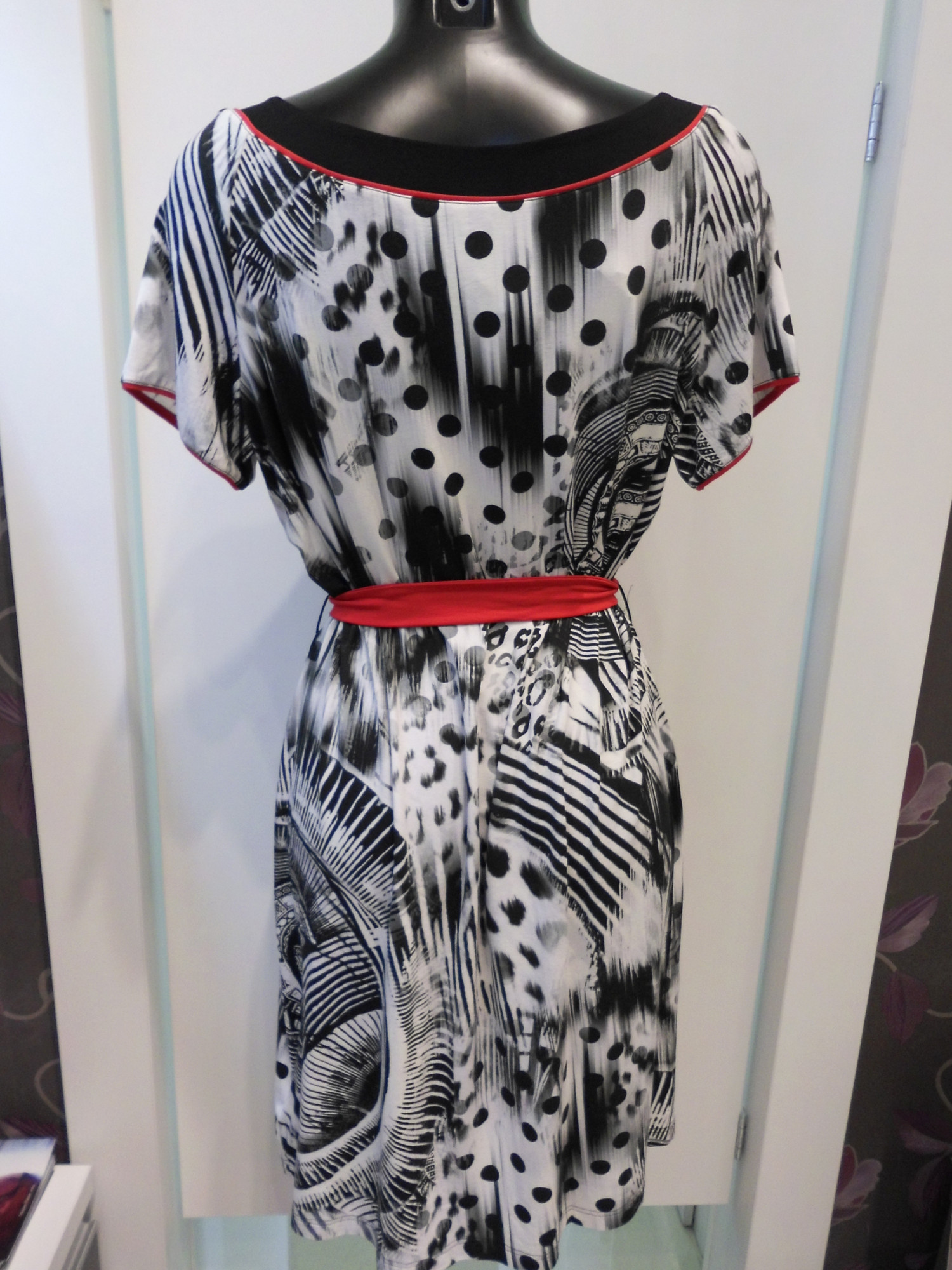 Elegantní šaty s krátkým rukávem , kulatý výstřih a rukávy jsou zdobené červenou výpustkou. Střih je mírně do ačka v pase je červený pásek na zavazování. Material 94% viskoza a 6% elastanu.