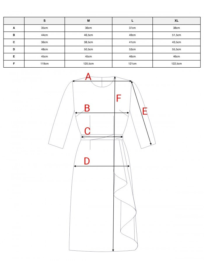Výstřih: kulatý Rukávy: 3/4 délky Sukně: rovná, s ozdobným volánem podél boční linie sukně, vzadu vysoký rozparek