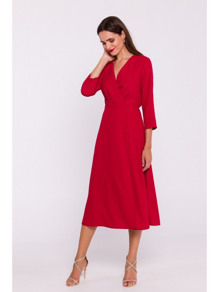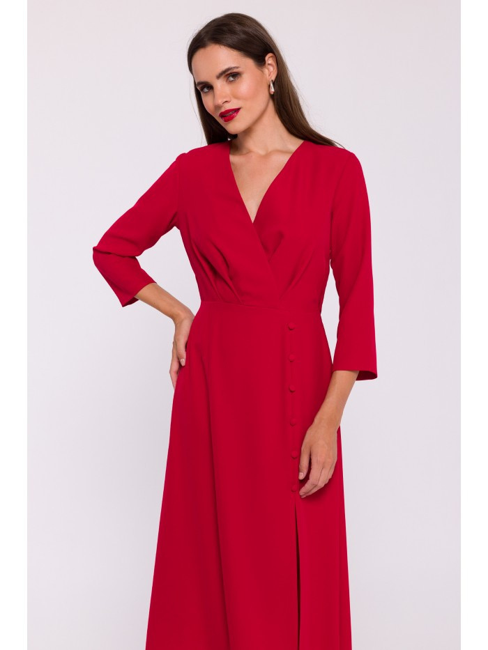 Tkané šaty se zavinovacím vrškem vysoký rozparek vpředu s ozdobnými knoflíky 7/8 rukávy délka pod kolena skrytý boční zip bez podšívky naše modelka je vysoká 174 cm a nosí velikost S navrženo a vyrobeno v Polsku