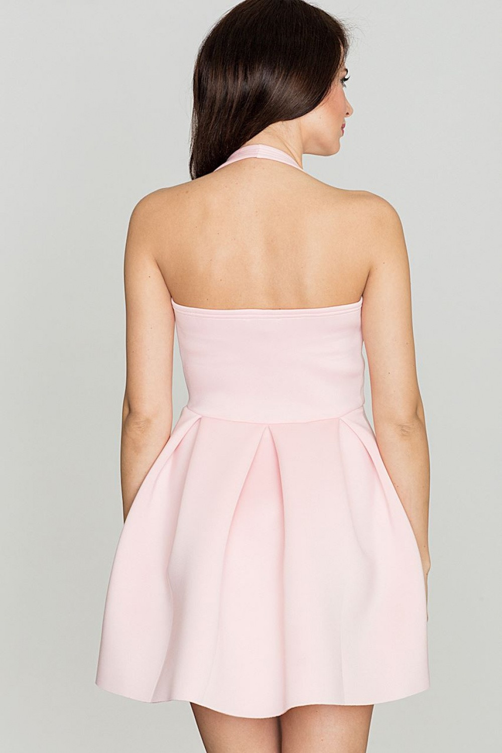 Krásné pěnové šaty bez zad, vypasované za krkem, asymetrický přední díl se zapínáním na knoflíky, sukně s protilehlým skládáním.