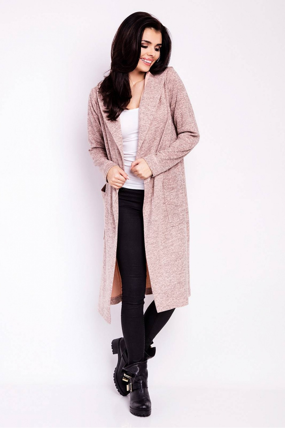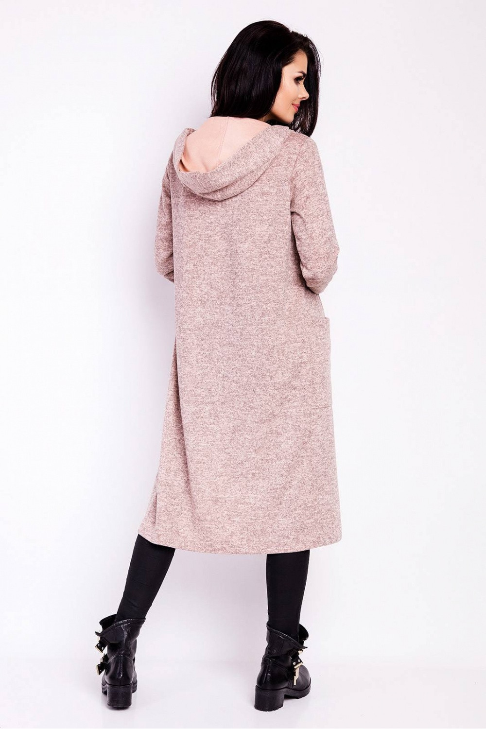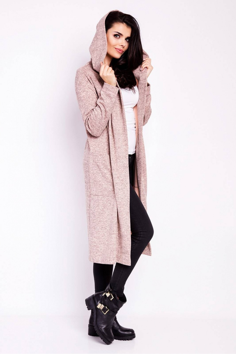 Dlouhý svetr volného střihu bez zapínání vpředu. Představený model má dlouhé rukávy, kapsy a kapuci.