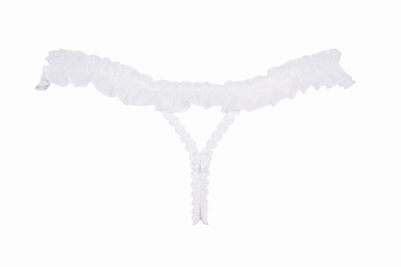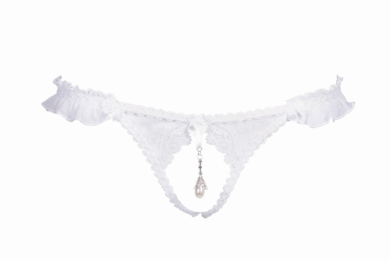Otevřené tanga zdobené krajkou a řaseným tylem. Na předním díle září perla ve tvaru slzy.