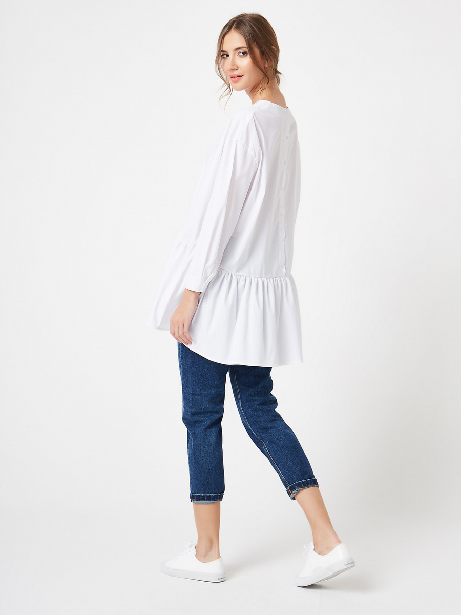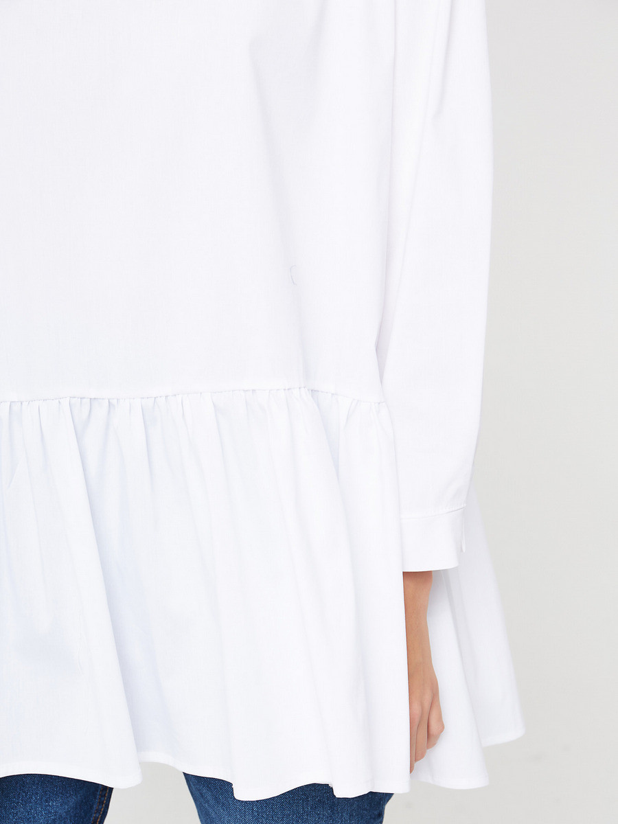 Košile je v pase rozšířená. Asymetrická delší délka. Zapínání na patentky na zadní straně.